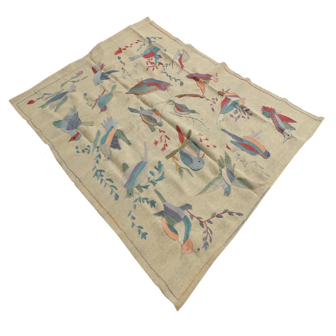 A 4x6 rectangular ivory flatweave wool rug featuring a vibrant, multicolored tribal bird and botanical pattern.