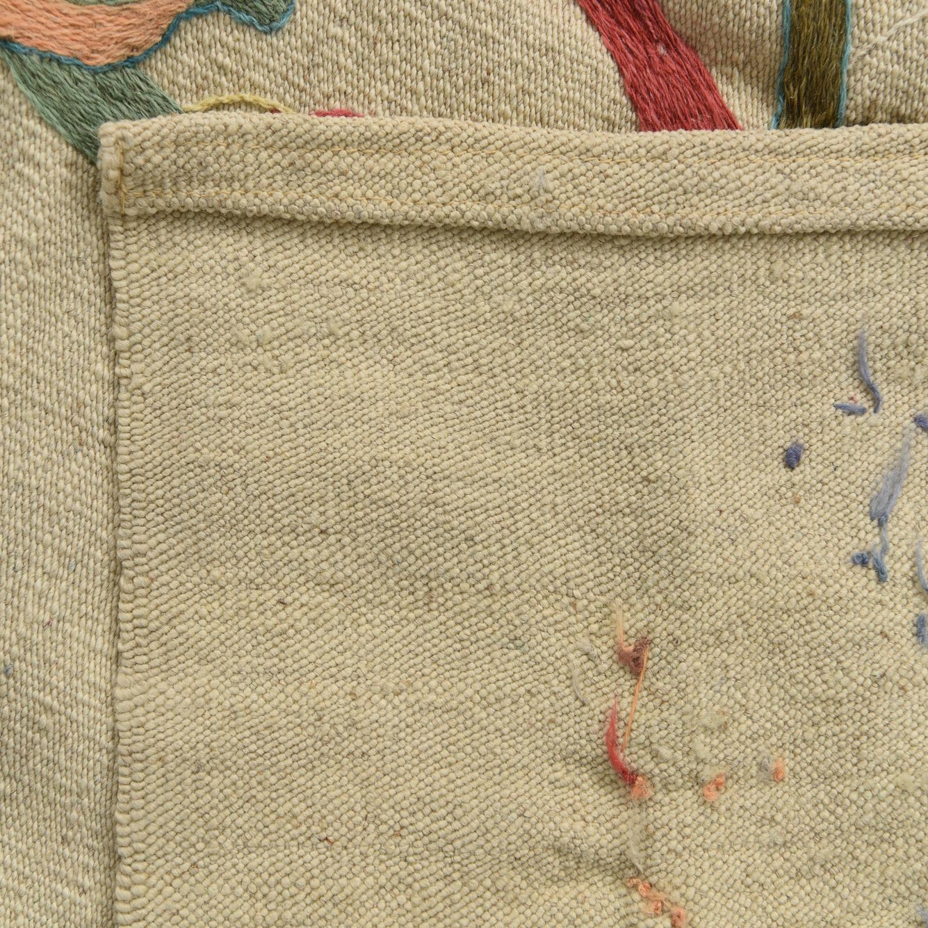 The flatweave texture offers a distinct, low-profile charm coupled with ease of placement under furniture and in entryways. This rug’s elegant design and color scheme makes it versatile enough for integration into a range of interior styles; from a traditional setting where it would provide a classic grace, to a bohemian space where it would enhance the eclectic mix of patterns and colors. Moreover, it could serve as an alluring centerpiece in a minimalist or contemporary environment, adding a touch of warmth and artistic flair. The Kilim Suzani rug is not only a practical floor covering but also an expression of cultural artistry that will enrich the aesthetic of any living space.