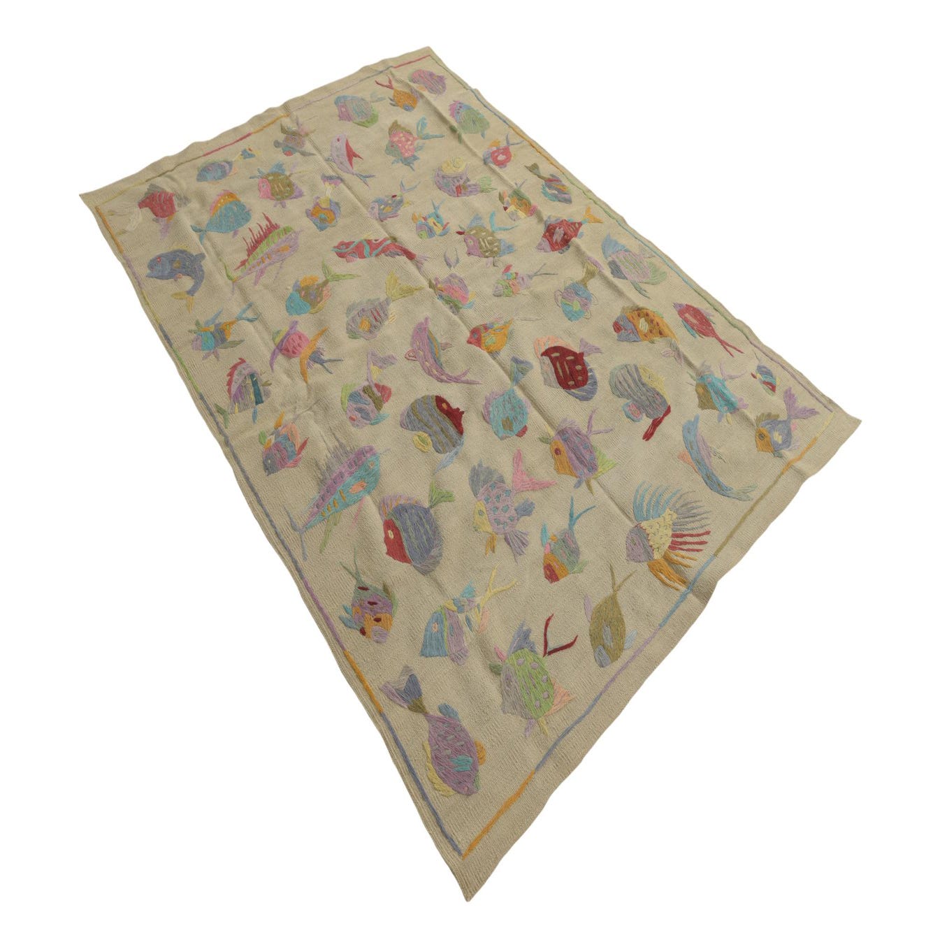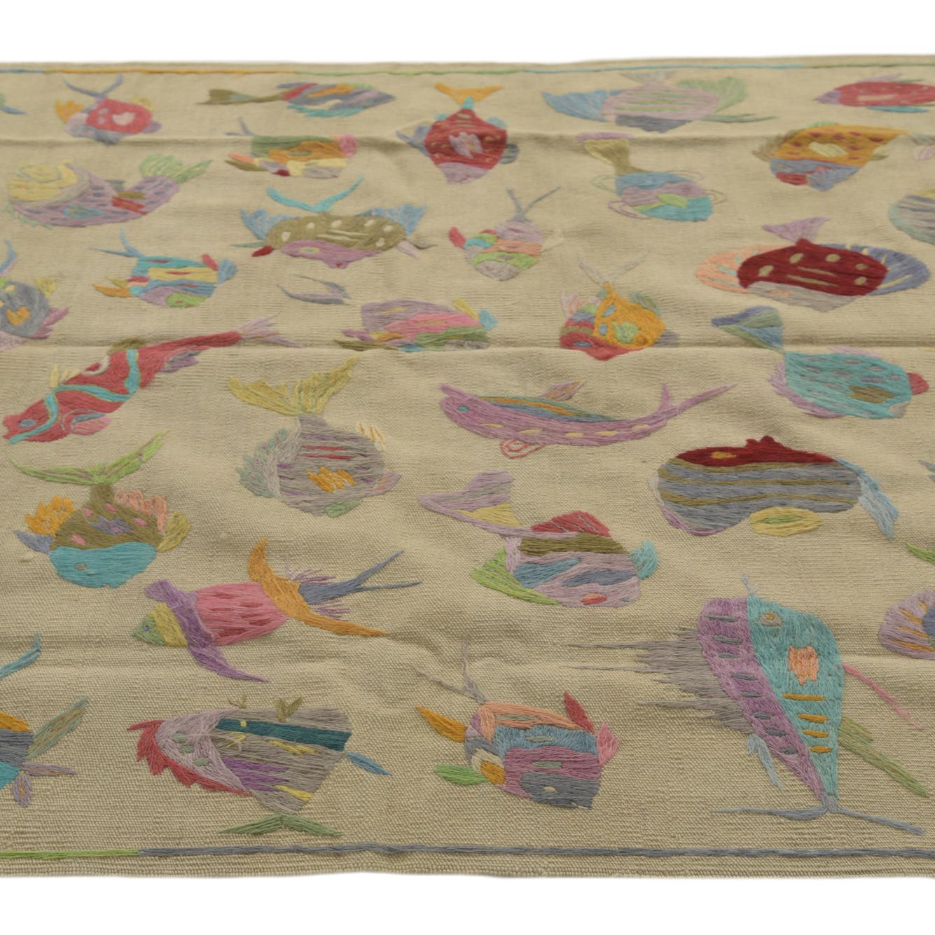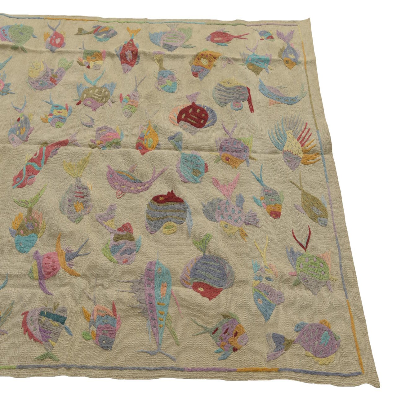 The Kilim Suzani hand-woven rug is a dynamic addition to any space, measuring 4x6 feet and made entirely from 100% wool. This piece showcases a vibrant pattern of stylized fish in an array of colors including ivory, beige, blue, brown, gold, peach, yellow, violet, red, and olive, set against a neutral ivory background. Each fish design is distinct, providing an eclectic mix of shades and shapes that give the rug a whimsical and playful charm.