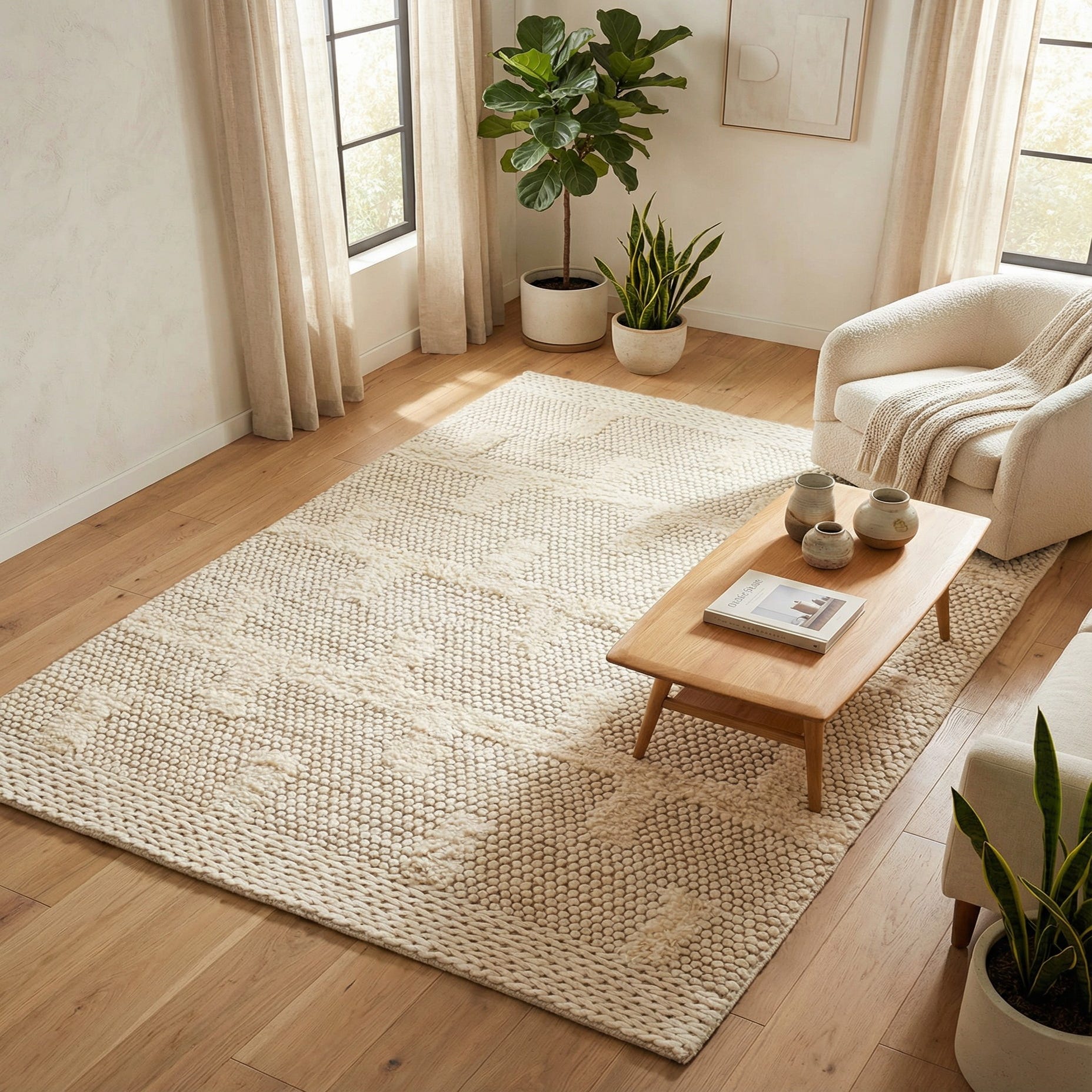 Works well in minimalist, Scandinavian, coastal, or farmhouse interiors where texture is the main point of interest. Use it to anchor a seating area under a coffee table, add a soft layer at the foot of a bed, or define a reading nook or entry space that benefits from a quiet, textured foundation.