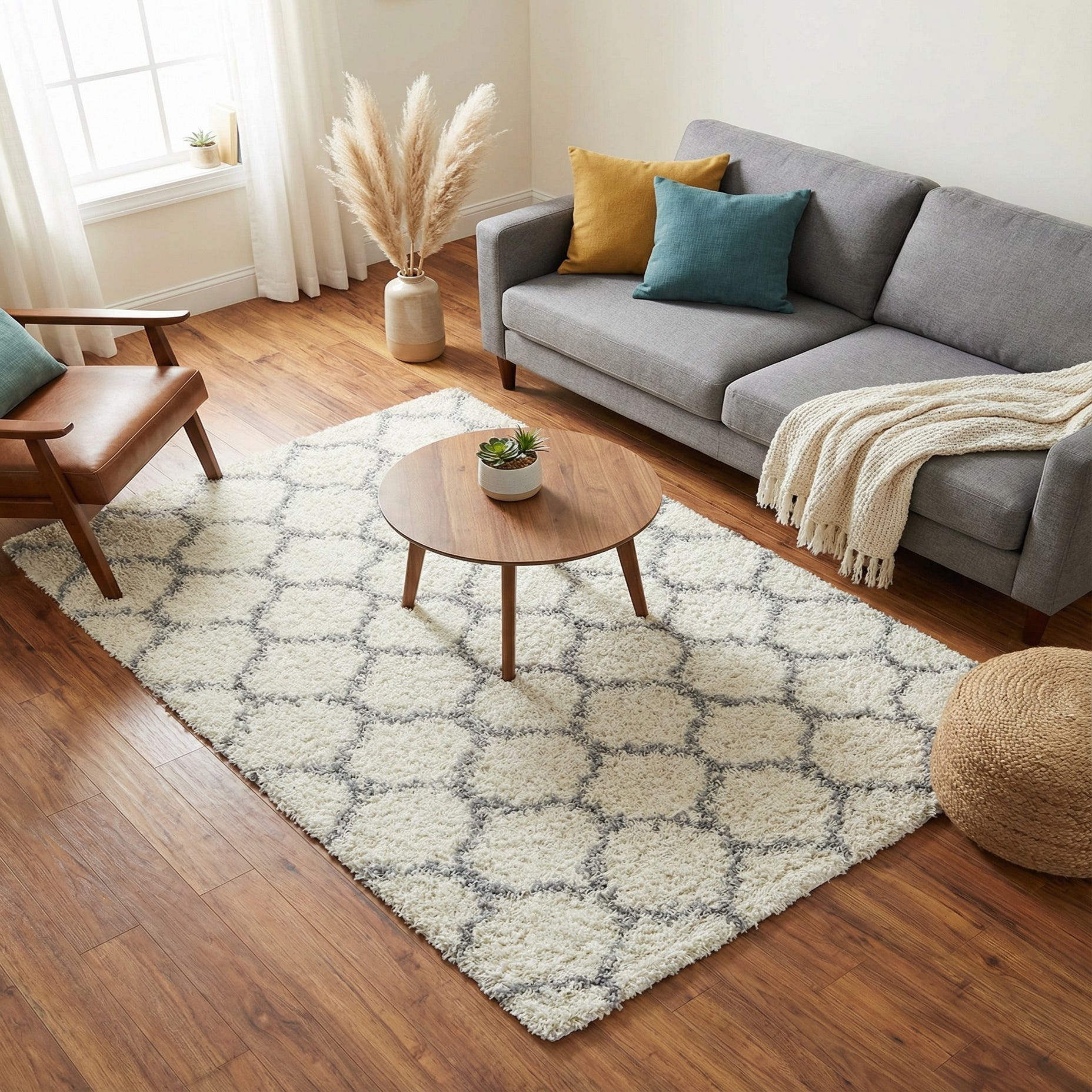 A soft, plush shag with an ivory ground and a subtle gray lattice pattern, this rug pairs cozy texture with a clean geometric look. The rounded diamond motif is formed by thin gray lines that contrast gently against the thick, cut pile, giving the surface a sense of depth and movement you can feel beneath your feet. Machine-made from 100% polypropylene, the dense shag offers a cushioned, welcoming hand that maintains the pattern’s clarity without overwhelming the room.