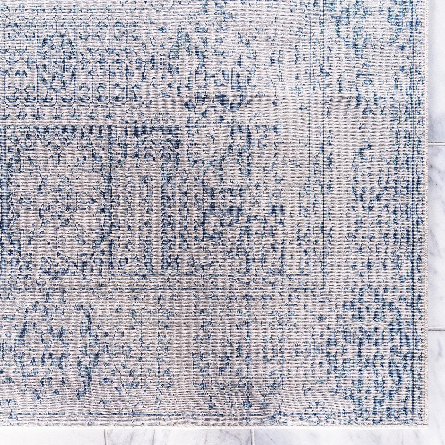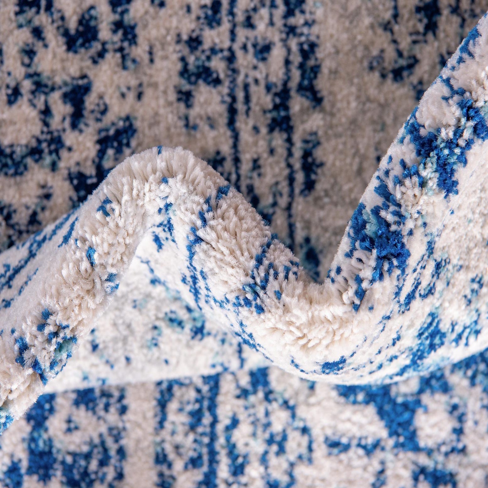 Primary color is Ivory. Colors in this rug include: Ivory, Blue, Gray, Navy Blue.
