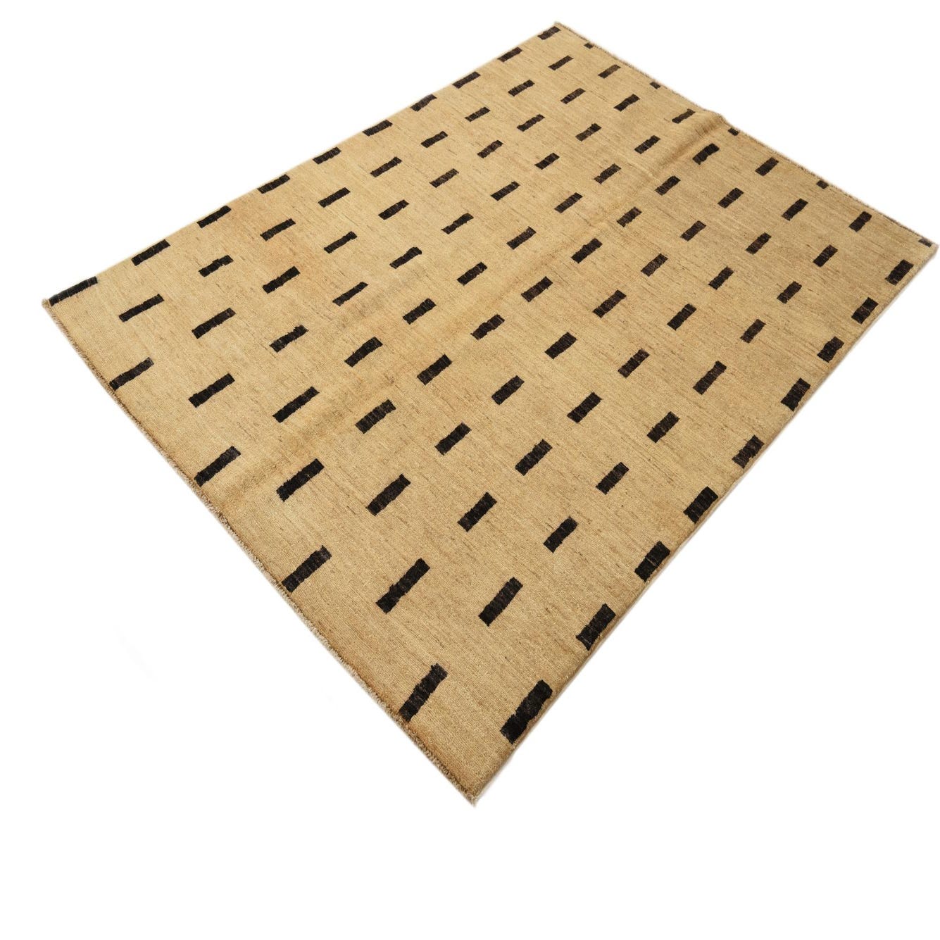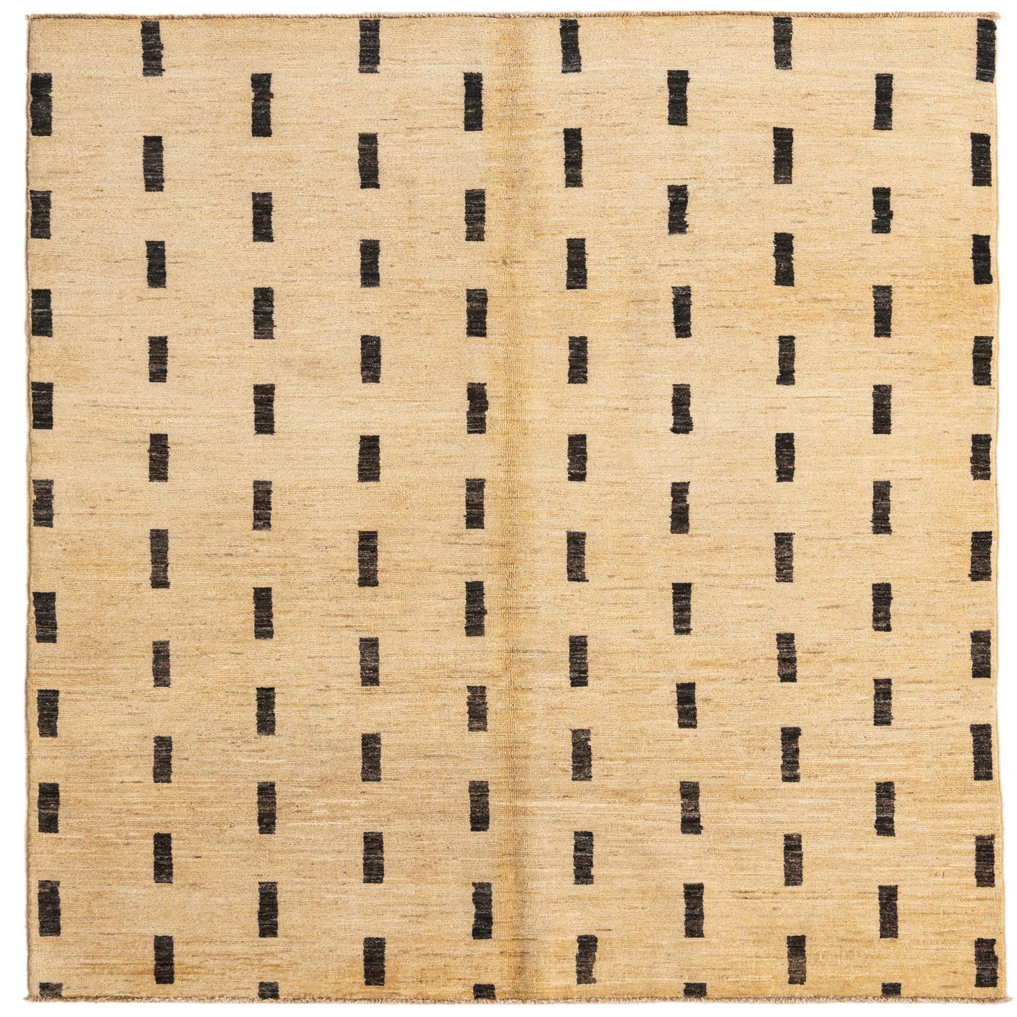 This Modern Ziegler area rug, measuring 4x6 feet, showcases a contemporary take on traditional craftsmanship. Hand-knotted of 100% hand-spun wool, it presents a pleasing tactile experience underfoot. The pattern features a minimalist design with an array of black dashes dispersed across an ivory background, creating a visual rhythm that is both dynamic and subtle. The inclusion of fringe adds a classic decorative touch.
