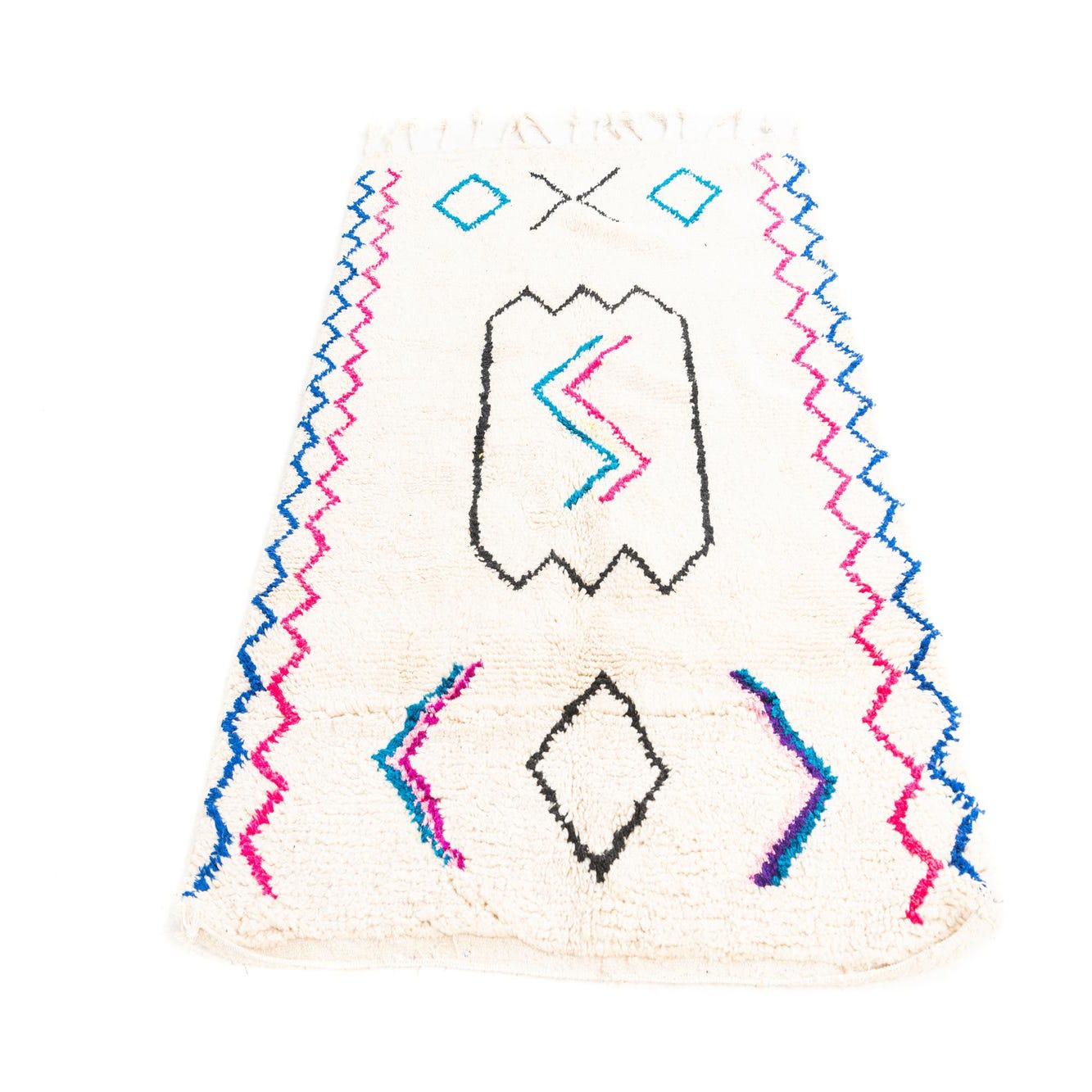 Part of the Moroccan collection, this hand-knotted rug is a visual representation of cultural heritage and craftsmanship. The piece measures 4x6 and is constructed from 100% wool, delivering a sumptuous texture that is both luxurious and resilient. The design showcases a traditionally inspired pattern featuring geometric motifs in a bold yet balanced assortment of colors – black, blue, and pink – against an ivory background. The presence of fringe detailing adds an authentic touch, characteristic of many handcrafted textiles.