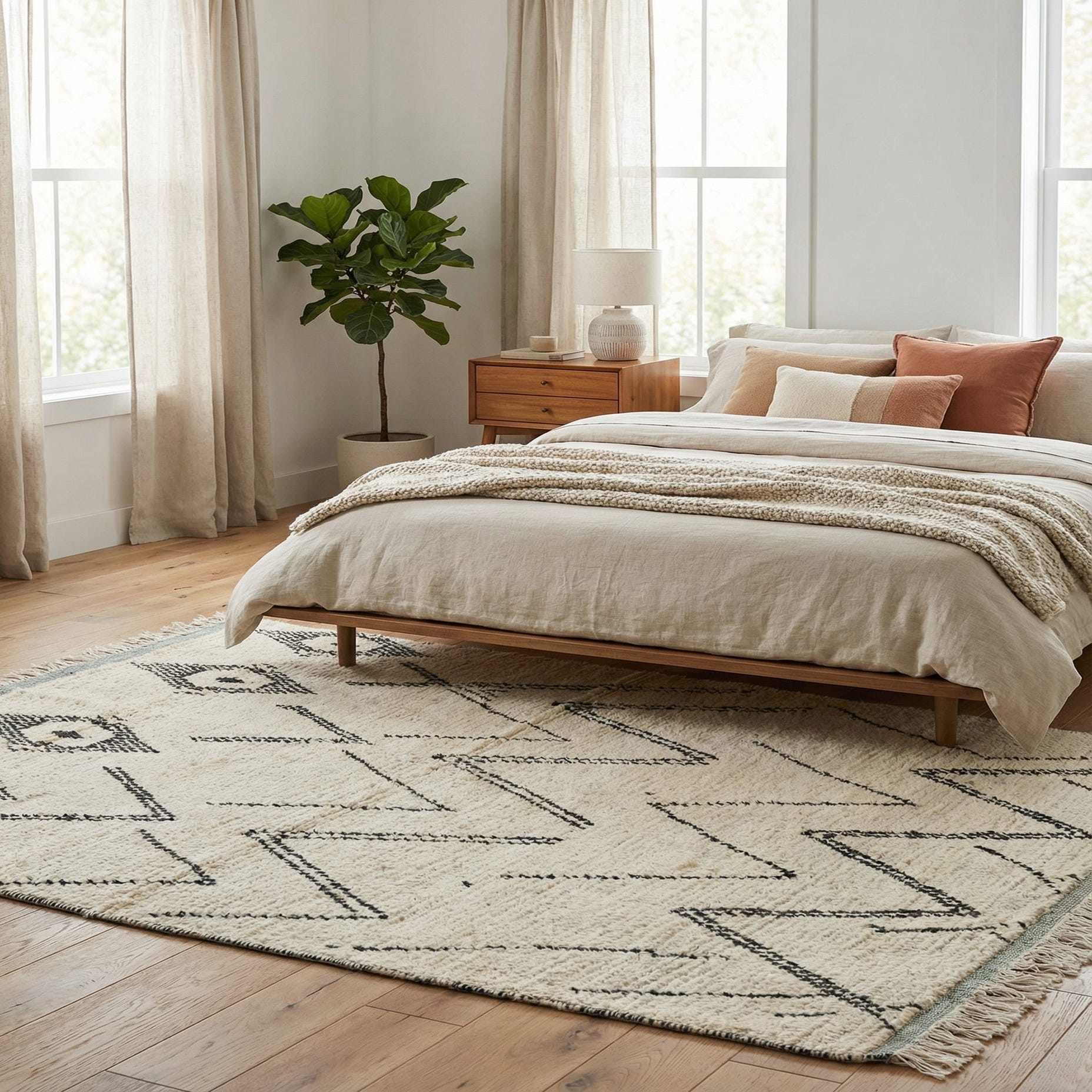 Thanks to its muted color scheme and distinct pattern, this rug would seamlessly integrate into a modern, Scandinavian, or minimalist setting. It could serve as a focal point in a living room or add a hint of visual interest in a monochromatic bedroom. Its neutral tones would also allow it to anchor a space with bolder colors or sit comfortably with other natural textures and elements.