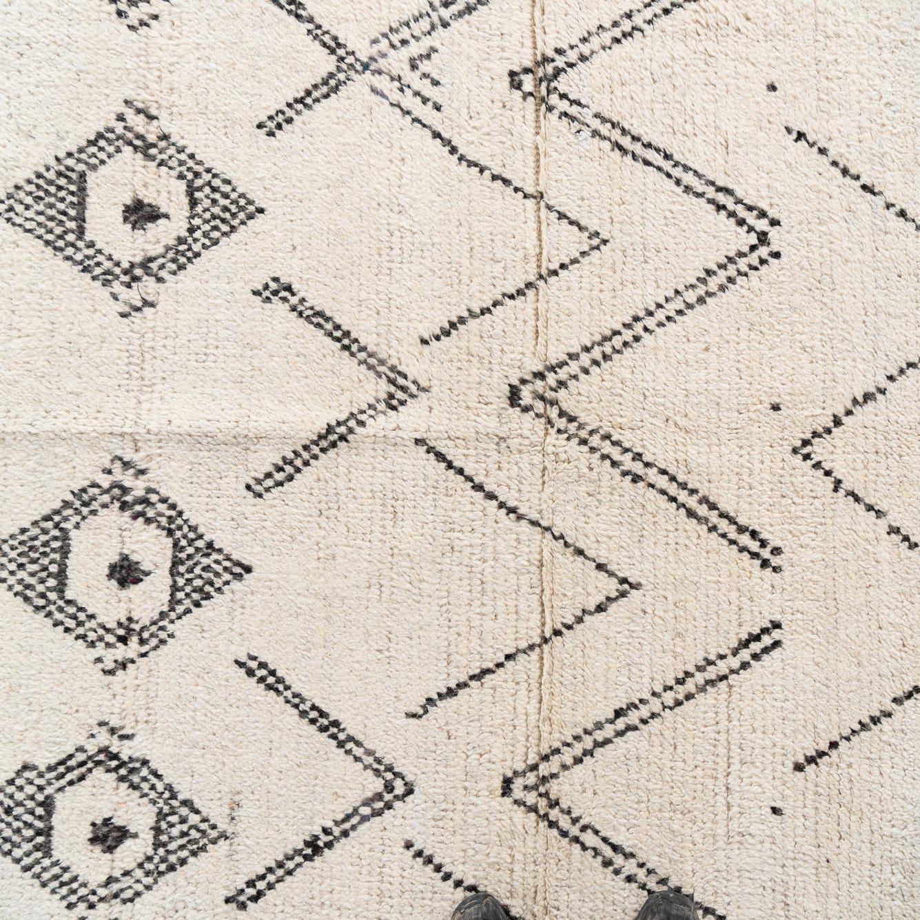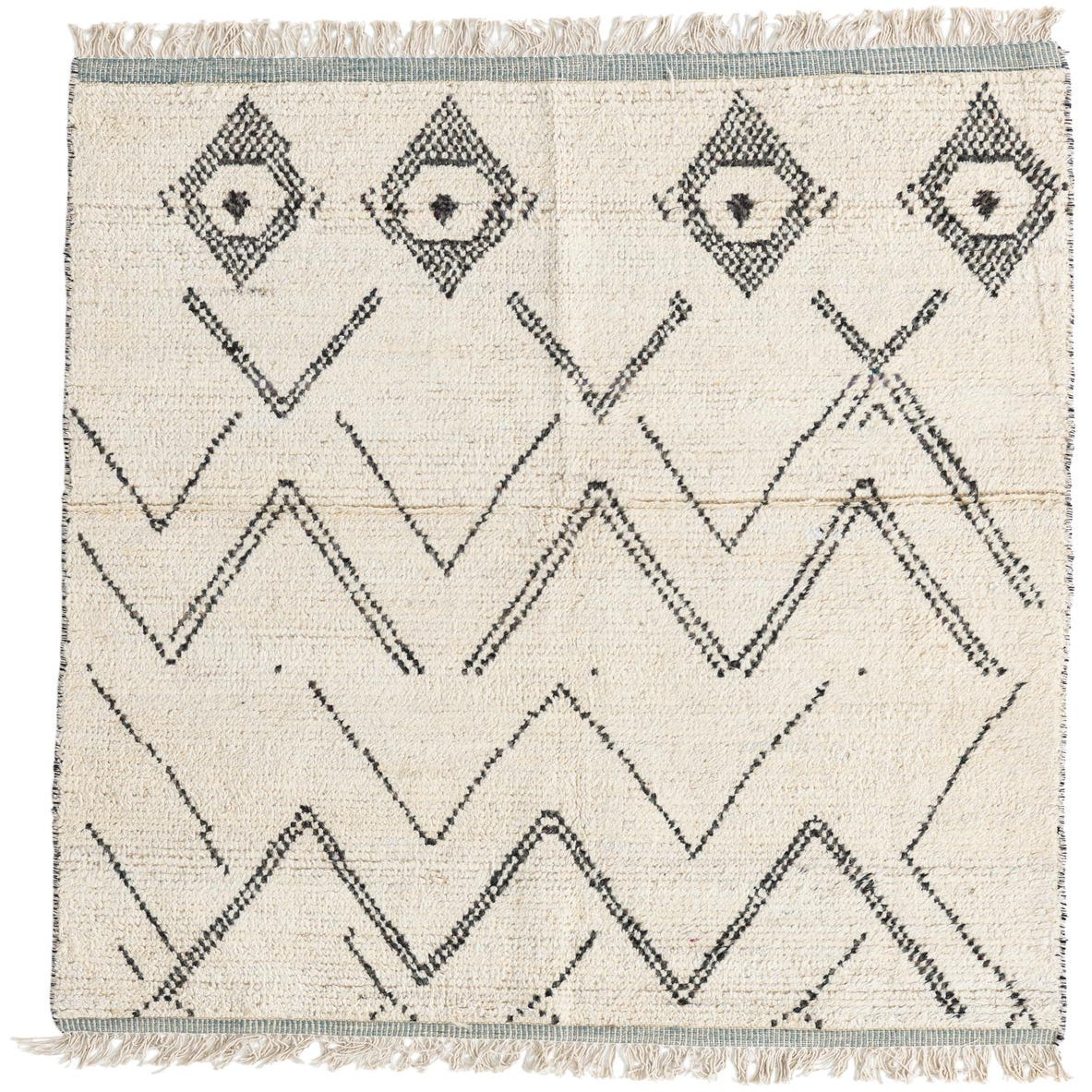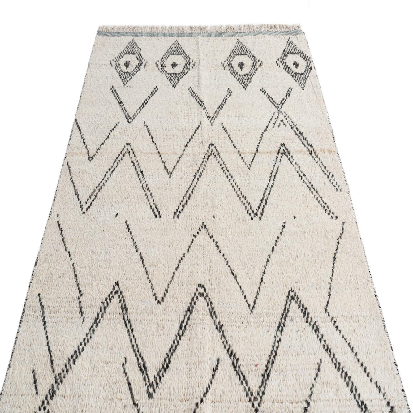 This Moroccan Collection rug presents a simplistic yet striking design, hand-knotted with 100% wool for a textured feel. The 4x6 rug features a crisp ivory background that is complemented by bold black geometric patterns, giving it a contemporary, yet timeless appeal. The clean lines and minimalist color palette allow for versatile placement in a variety of interior design scenarios.