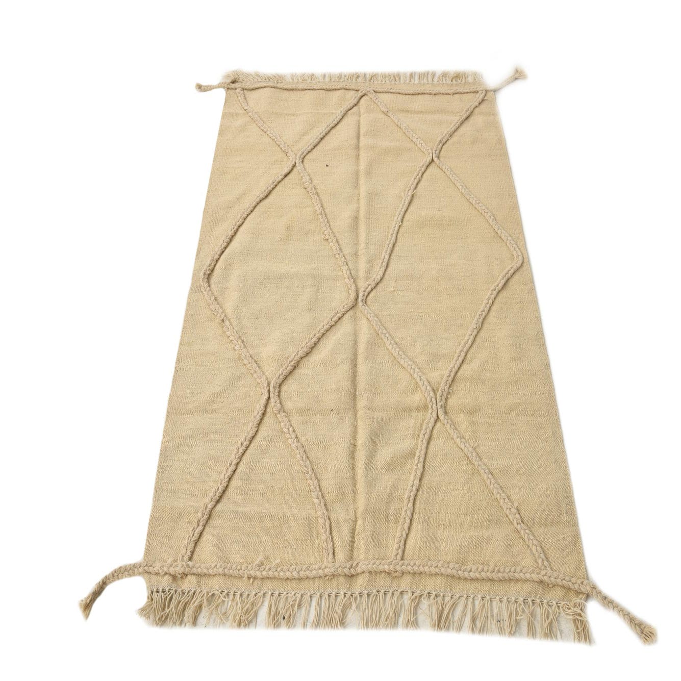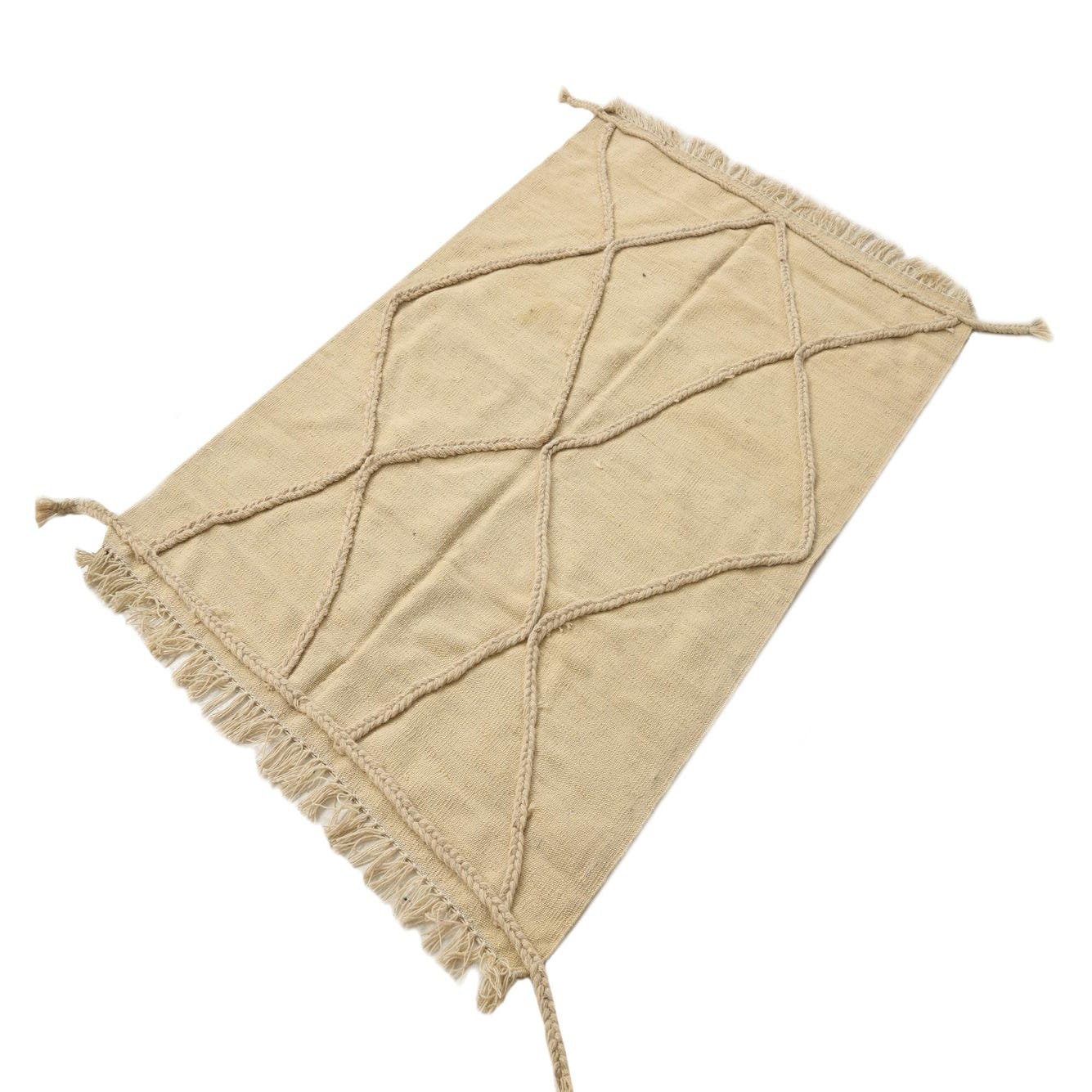 A 4x6 rectangular ivory wool rug with a raised braided diamond pattern and fringed ends, suitable for a living room.