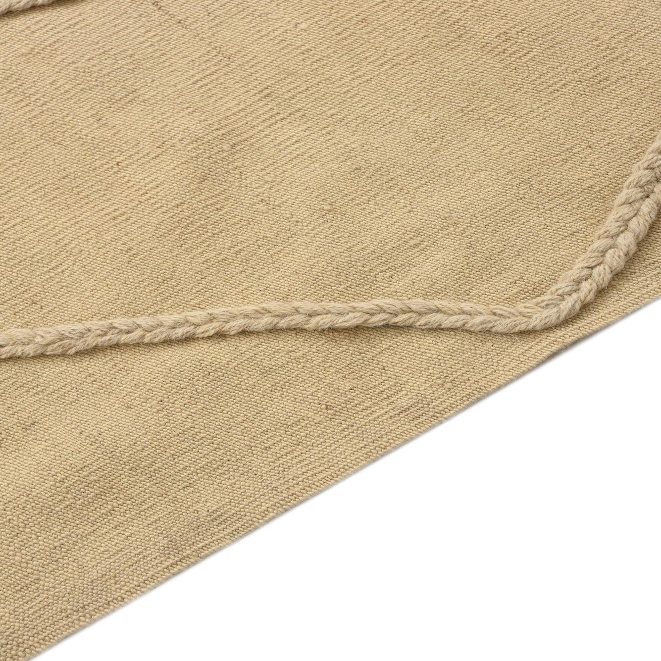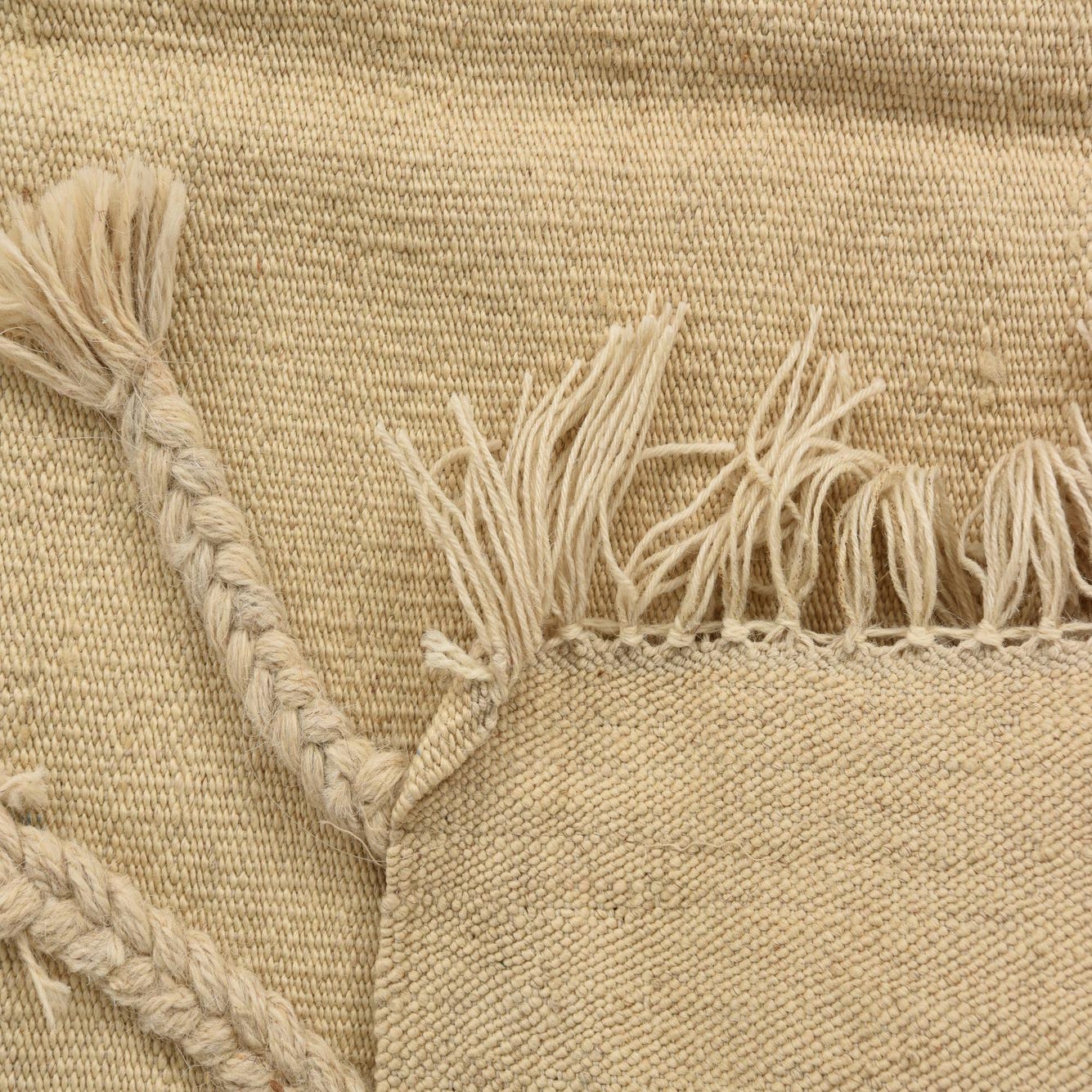 The rug's fringe detailing adds a hint of traditional craftsmanship while keeping the overall aesthetic suitable for contemporary spaces. Due to its neutral color palette and understated design, this rug would seamlessly integrate into a variety of settings, from minimalist to Scandinavian-inspired interiors or even transitional spaces seeking a balance between classic and modern elements. It could serve as a soothing foundation in a living room, under a coffee table, or in a bedroom, where its textural qualities would contribute to a serene atmosphere.