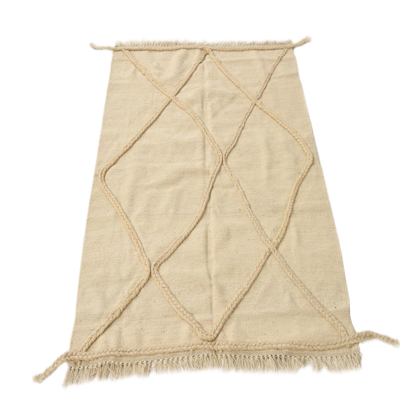A 4x6 rectangular ivory wool shag rug with a braided diamond tribal pattern and fringed edges.