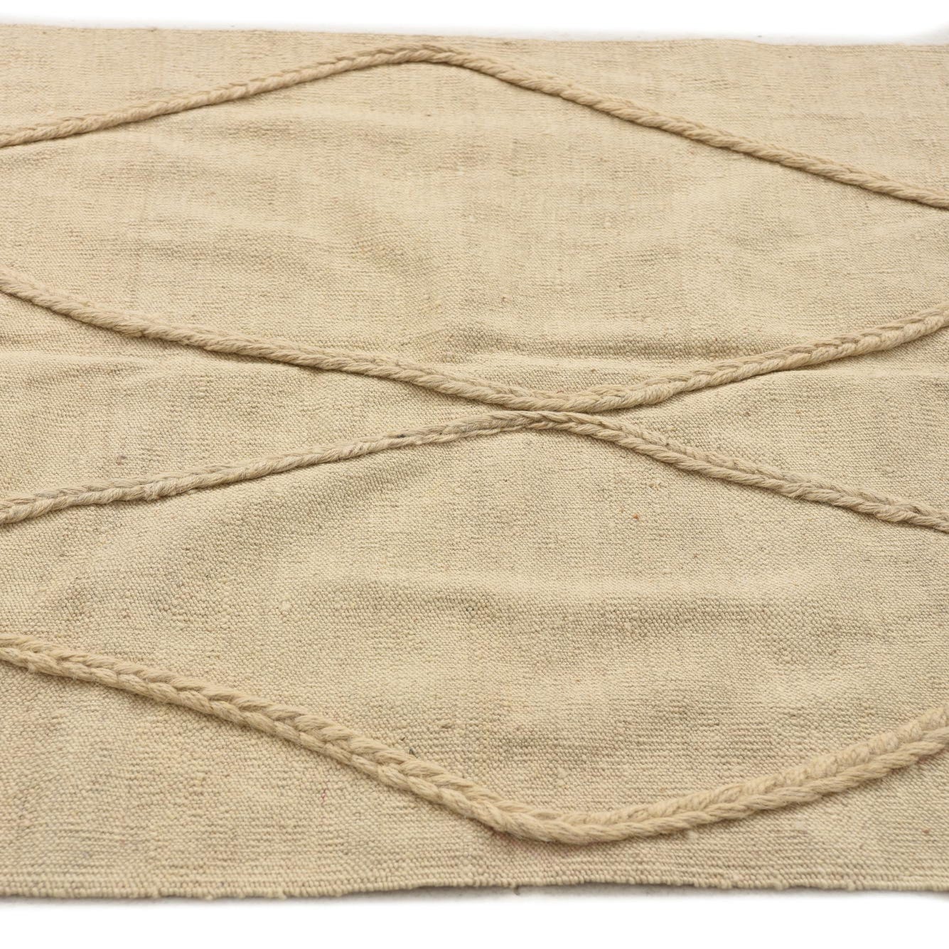 This Moroccan collection rug is an authentic, hand-knotted piece crafted from 100% wool, measuring 4x6 feet. It features a minimalist design with a clean ivory background that serves as a versatile canvas for the subtle geometric patterns delineated by raised tufting. The pattern constructs a series of interconnected diamonds, imparting a sense of structure and timeless appeal. The texture is naturally soft to the touch and inviting, reflecting the careful handiwork and quality materials used.
