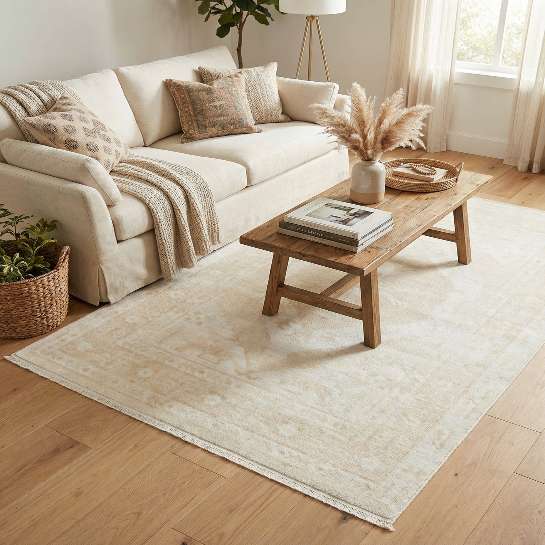 A 4x6 rectangular ivory modern rug with a subtle traditional pattern, ideal for a living room or entryway.
