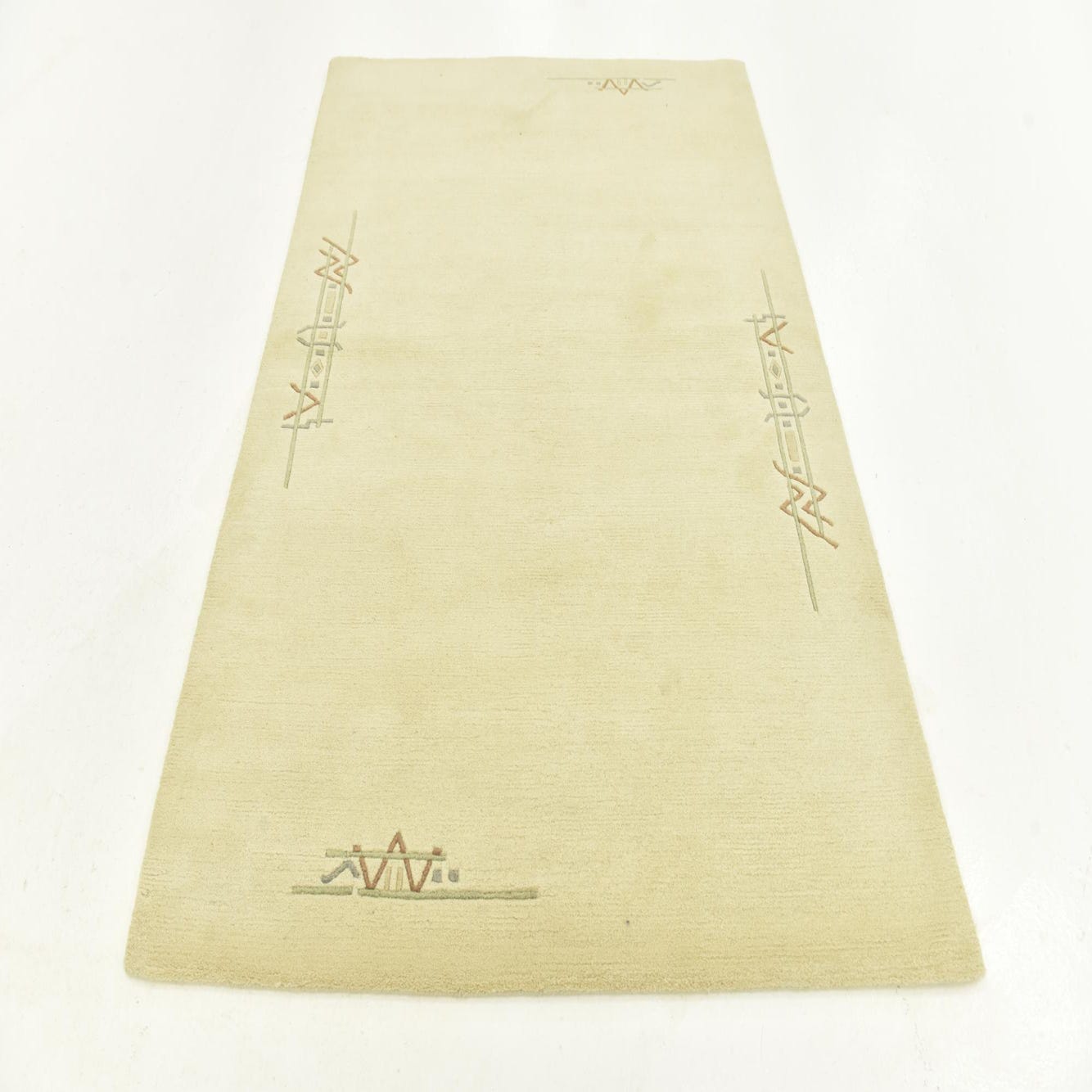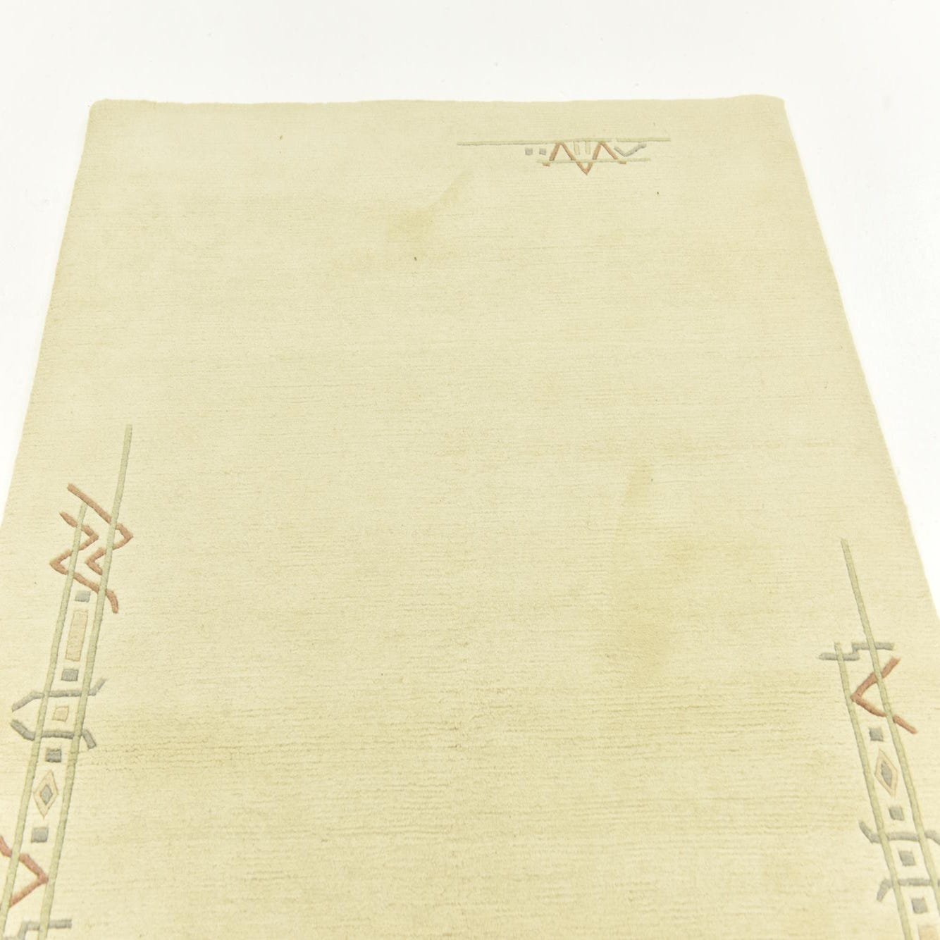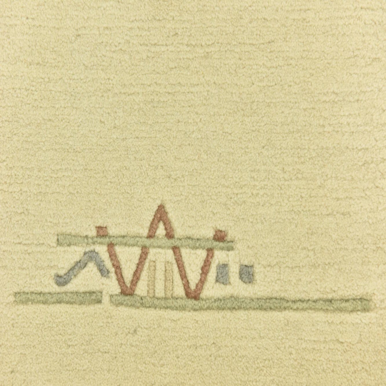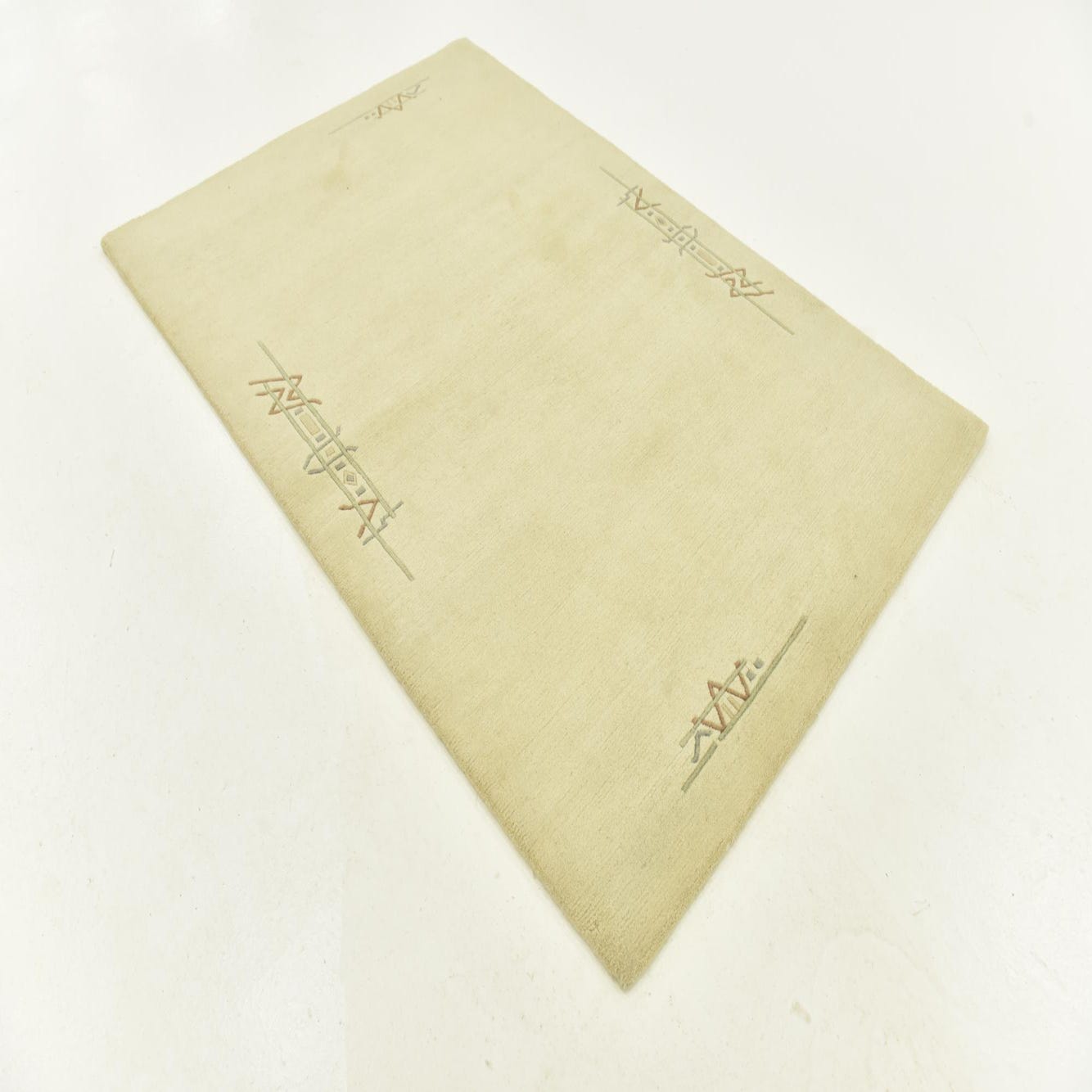 A 4x6 rectangular ivory wool rug with subtle modern abstract patterns in muted green, terracotta, and grey at each corner.