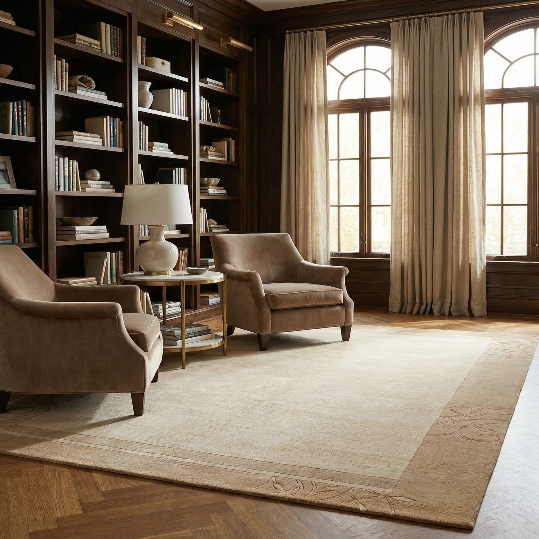 The simplicity of its design allows this rug to harmonize with a variety of interior settings, including modern minimalist, contemporary, and transitional spaces. Its serene colors and subtle detailing make it particularly suitable for living areas, studies, or bedrooms where a calm and restful ambiance is desired. This rug would also pair well with furniture in natural wood tones or with a neutral color scheme to create a balanced look. Its hand-knotted construction ensures a quality that is built to last, making this an enduring choice for any home.