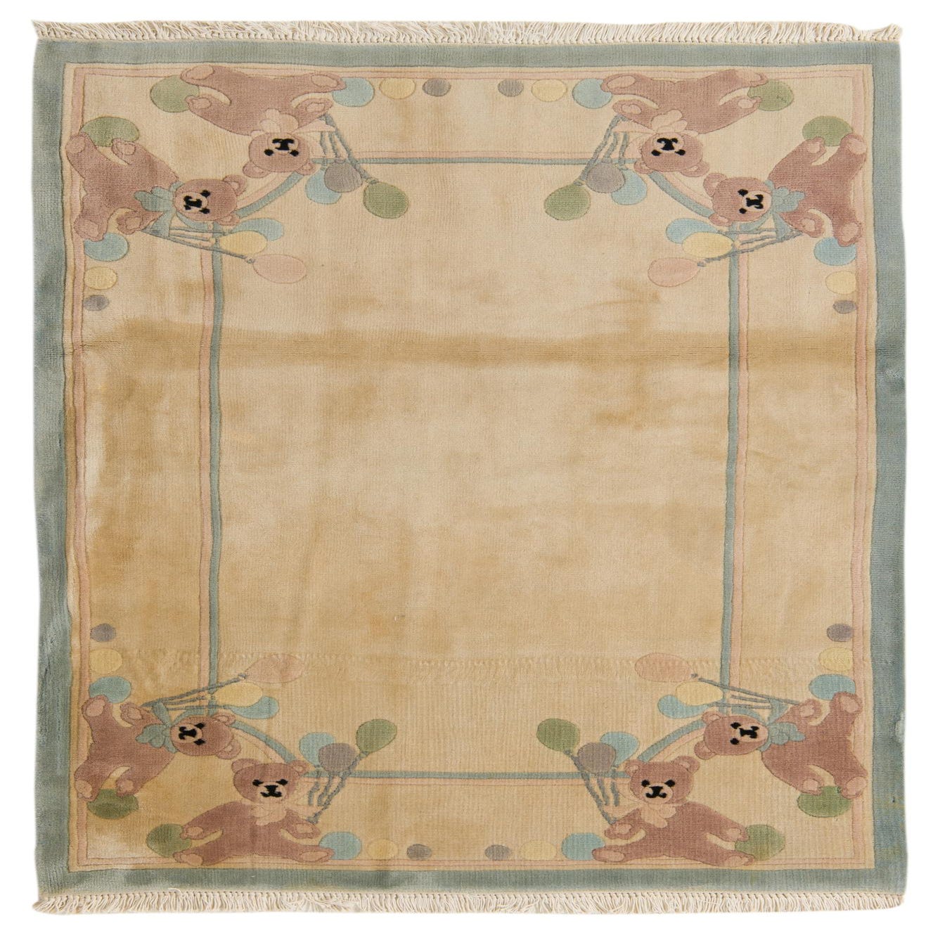 A 4x6 rectangular ivory wool rug with a playful border featuring brown teddy bears holding colorful balloons and pastel polka dots, ideal for a child's room.