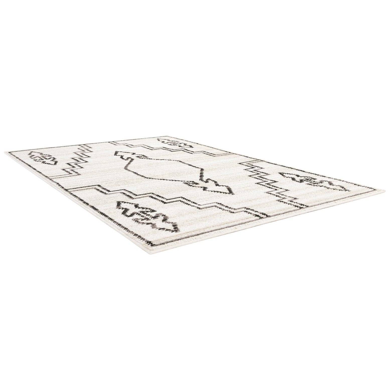 A 4x6 rectangular ivory and cream modern area rug with a bold black geometric pattern, featuring a central diamond and arrow motifs.