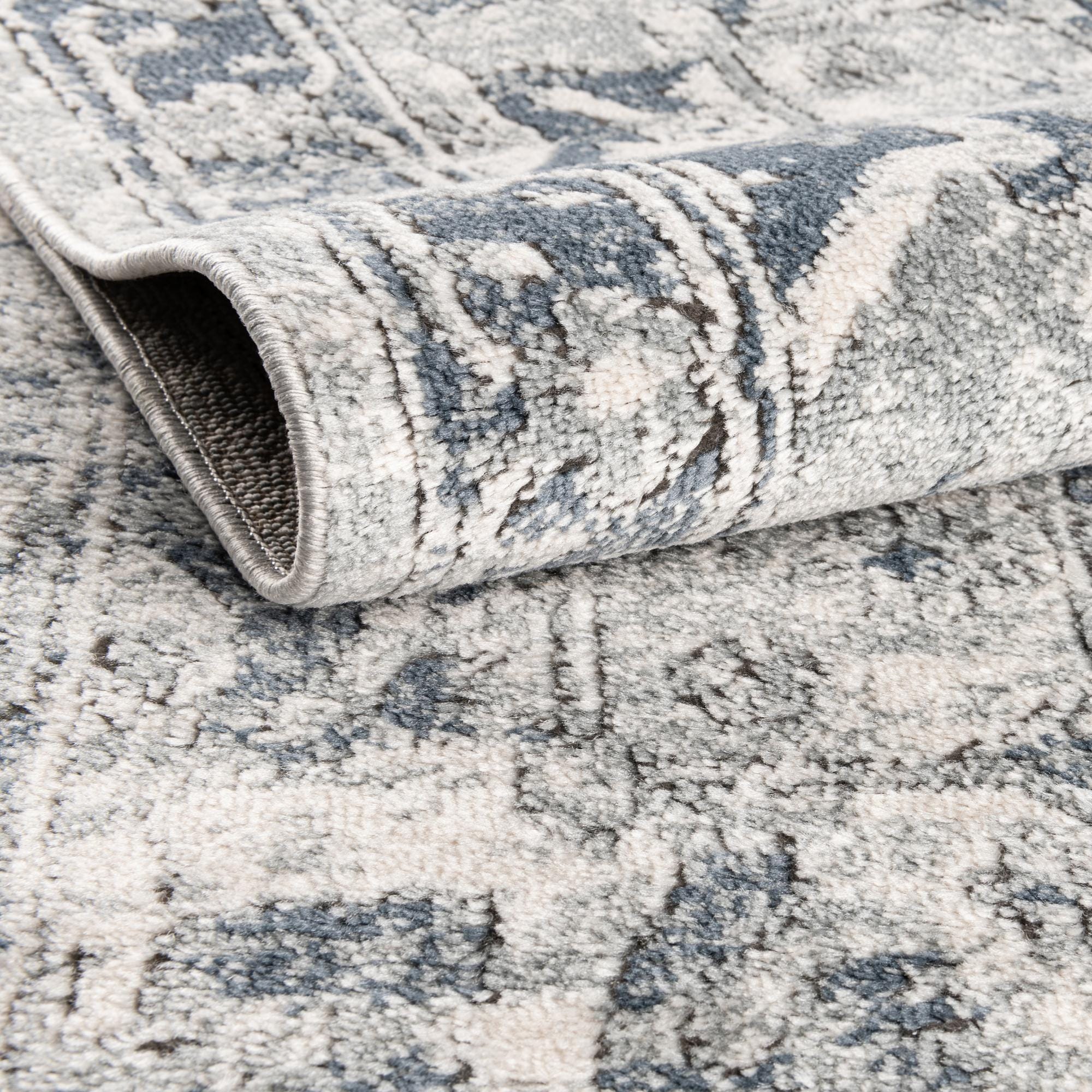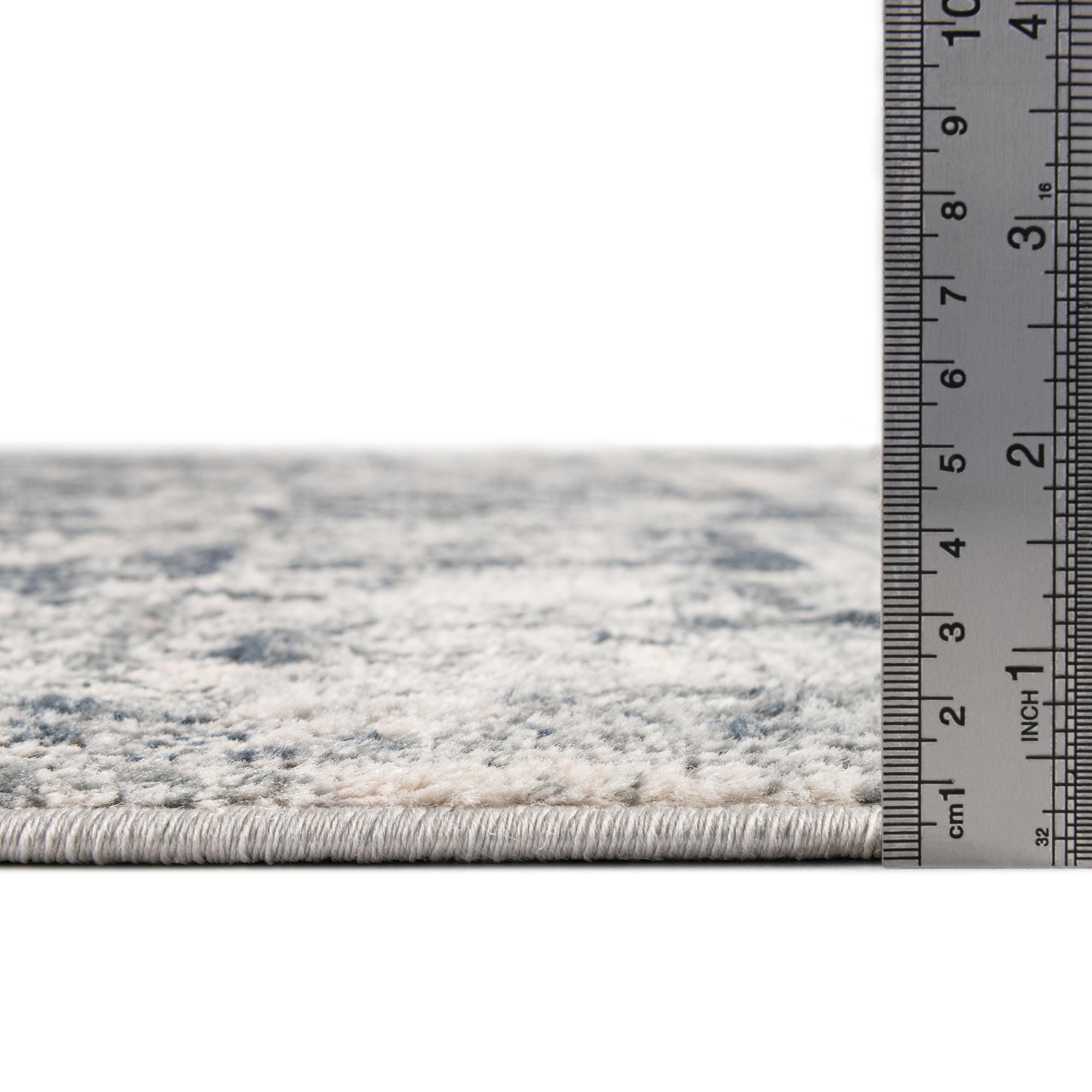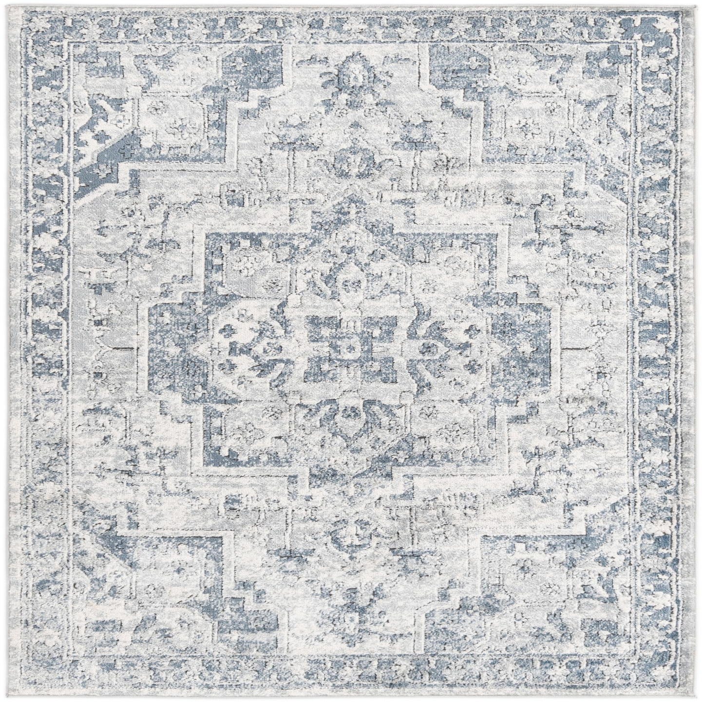 Primary color is Ivory. Colors in this rug include: Ivory, Blue, Gray, Navy Blue, Light Blue.