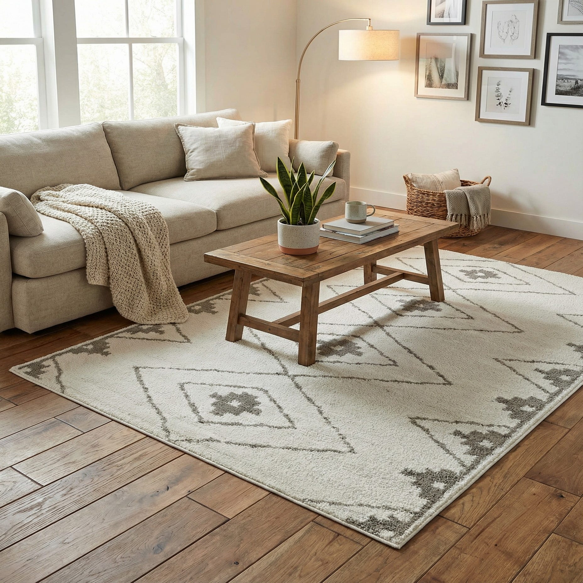 This rug works well in light, neutral interiors—Scandinavian, modern farmhouse, or transitional rooms where texture and quiet pattern are needed. Use it to anchor a seating area, place it at the foot of a bed, or brighten an entry or reading nook; it pairs nicely with natural wood tones, linen upholstery, and matte metal accents for a relaxed, cohesive look.