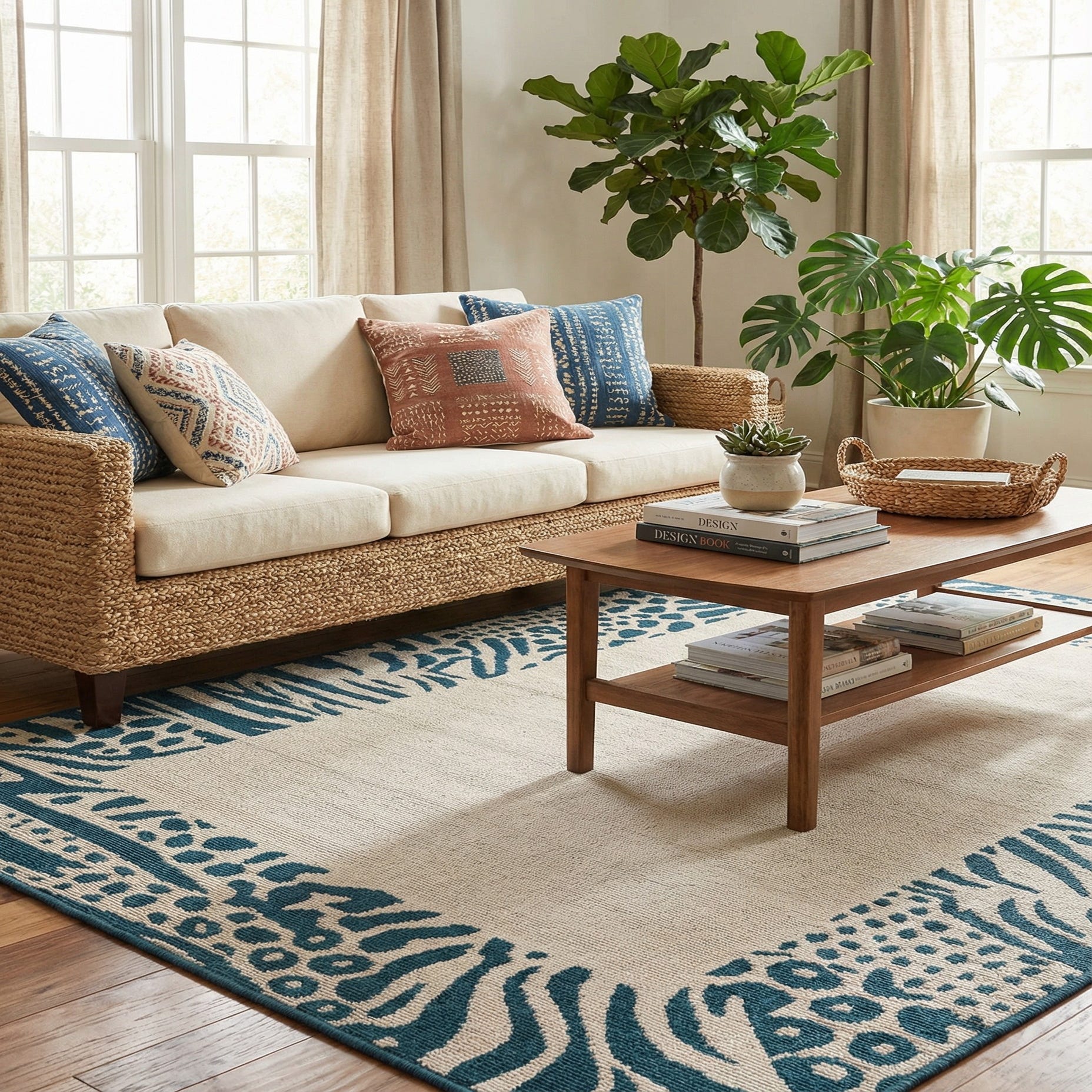 When considering interior design scenarios, this Outdoor Safari rug would be well-placed in a minimalist setting where its bold border can serve as an accent piece, or in a more eclectic space where it complements a mix of patterns and textures. Whether paired with wooden furniture for a naturalistic setting or with modern, sleek pieces for a contemporary look, this rug is adaptable to various styles, providing a chic and functional foundation.