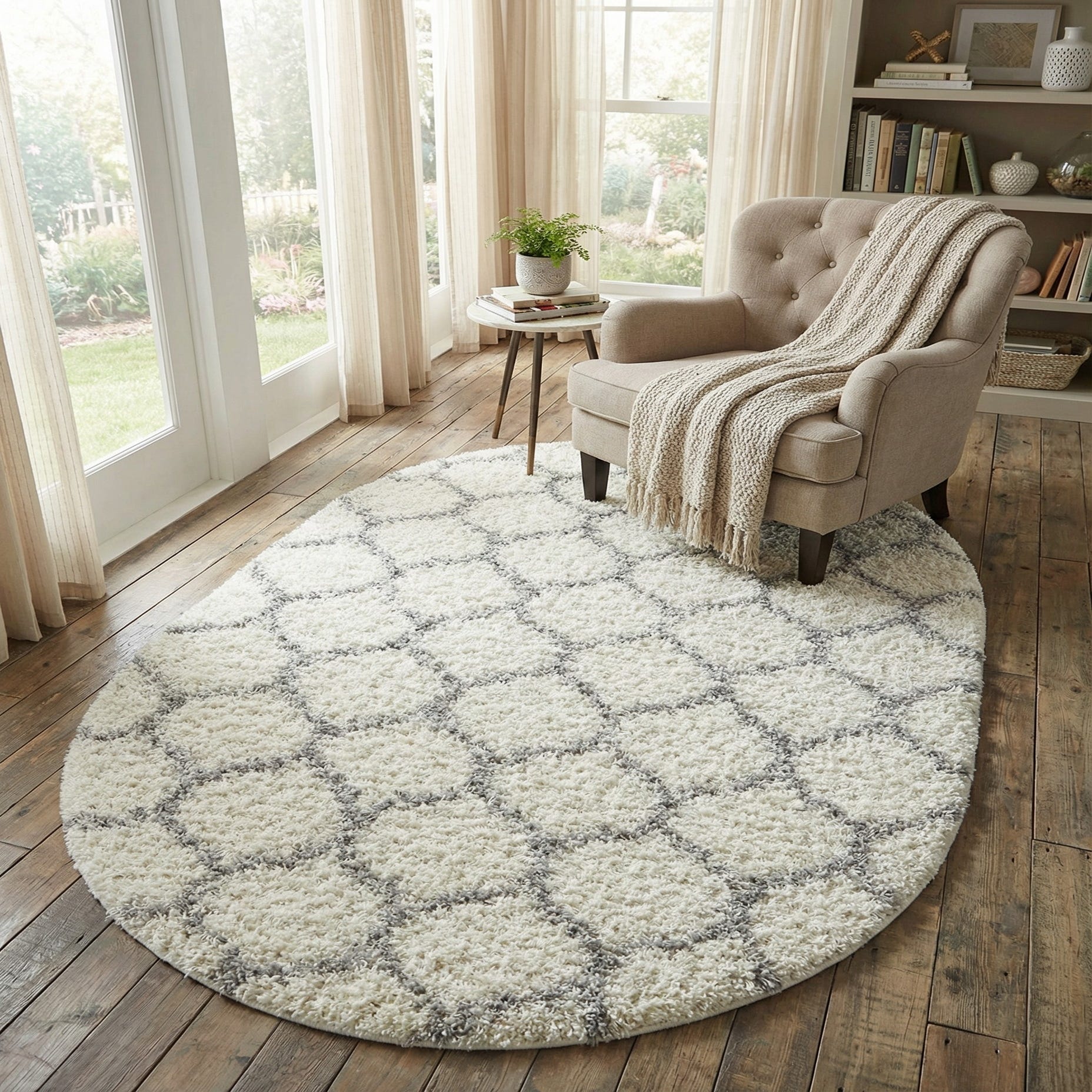 The neutral ivory-and-gray palette suits modern, transitional, or Scandinavian interiors and layers easily with light woods, linen upholstery, and muted metallic accents. Use it to anchor a small seating area, warm a bedside landing, or add softness to a reading nook or nursery; the oval shape also complements round tables and curved furniture arrangements.