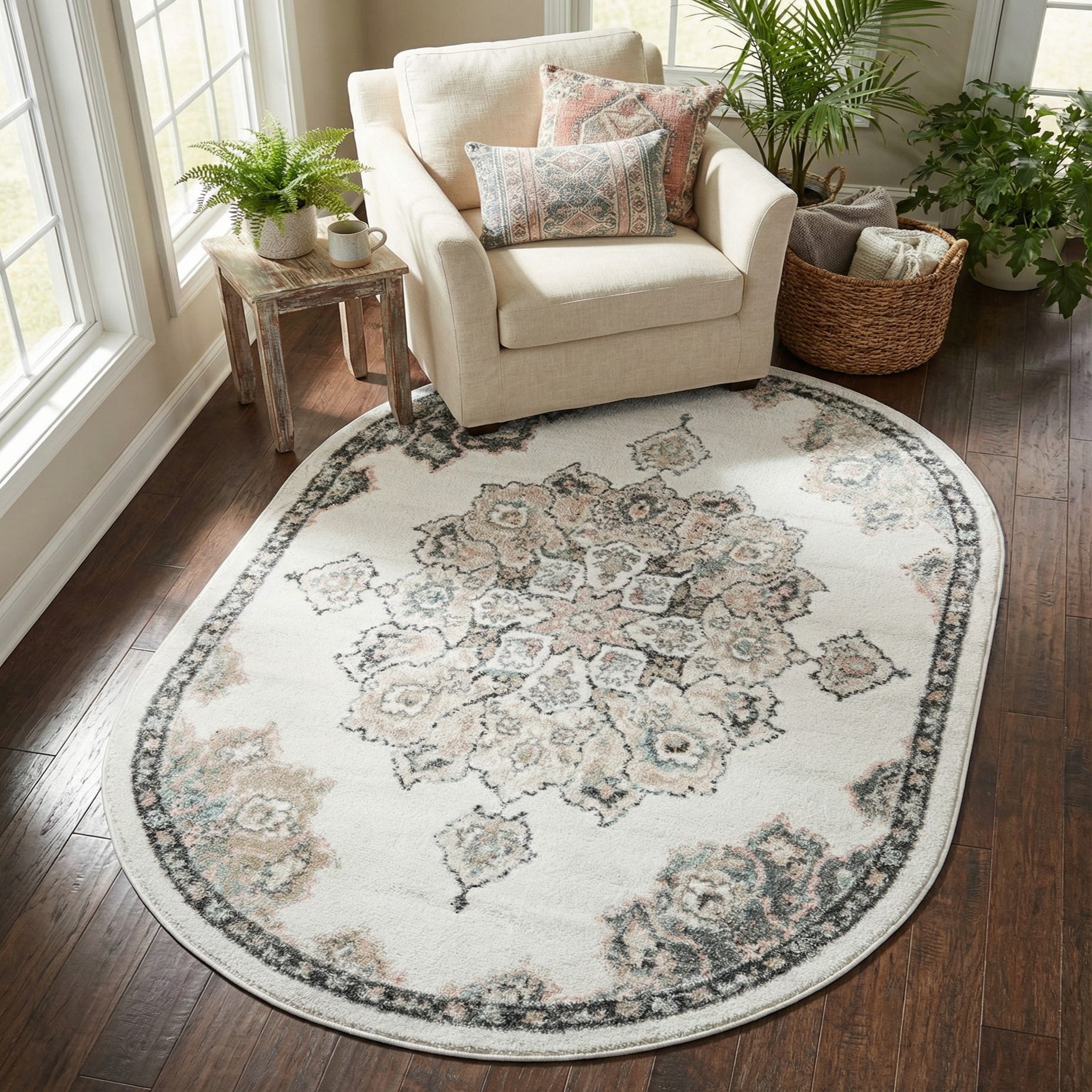 Machine-made from 100% polypropylene, the pile is low-profile with a smooth, slightly plush hand that feels comfortable underfoot while maintaining a tidy appearance. The oval shape works well in an entry or foyer, at the foot of a bed, layered beneath a round dining table, or as an anchor for a cozy seating nook. Pair it with light woods and linen upholstery for a relaxed, contemporary farmhouse look, introduce charcoal accents and matte metals for a modern-transitional scheme, or soften a neutral palette with the rug’s warm beige and pink tones.