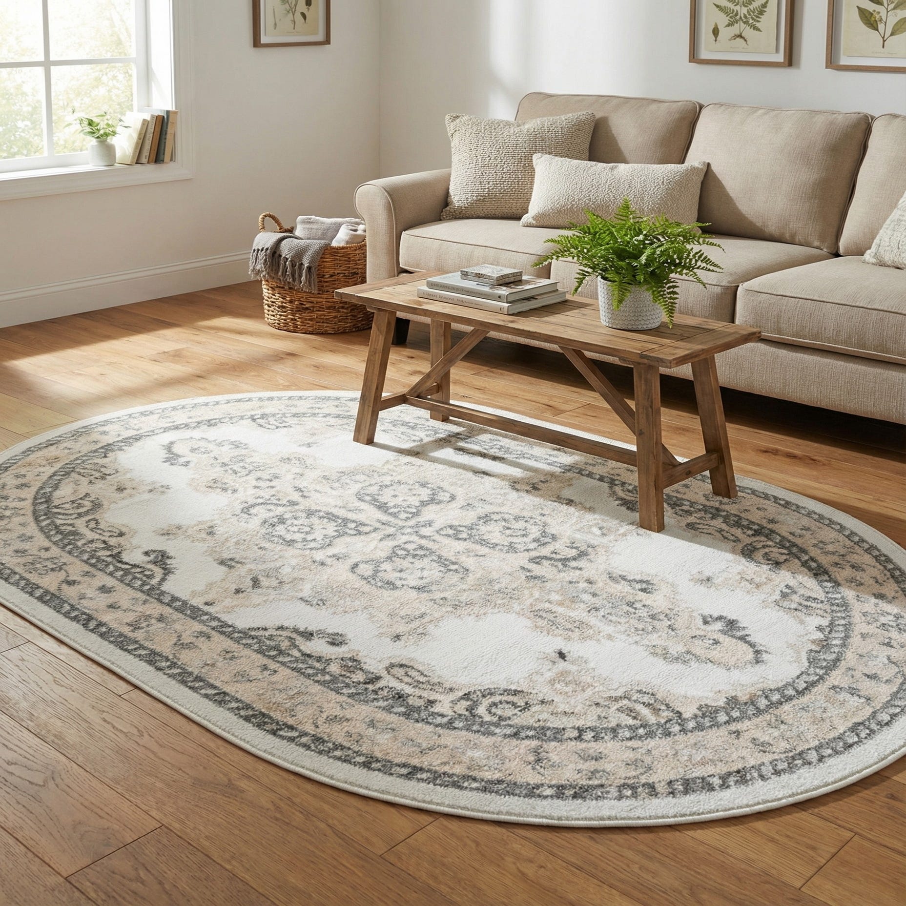 An oval 4'x6' ivory and cream rug with a traditional medallion pattern and a grey border.