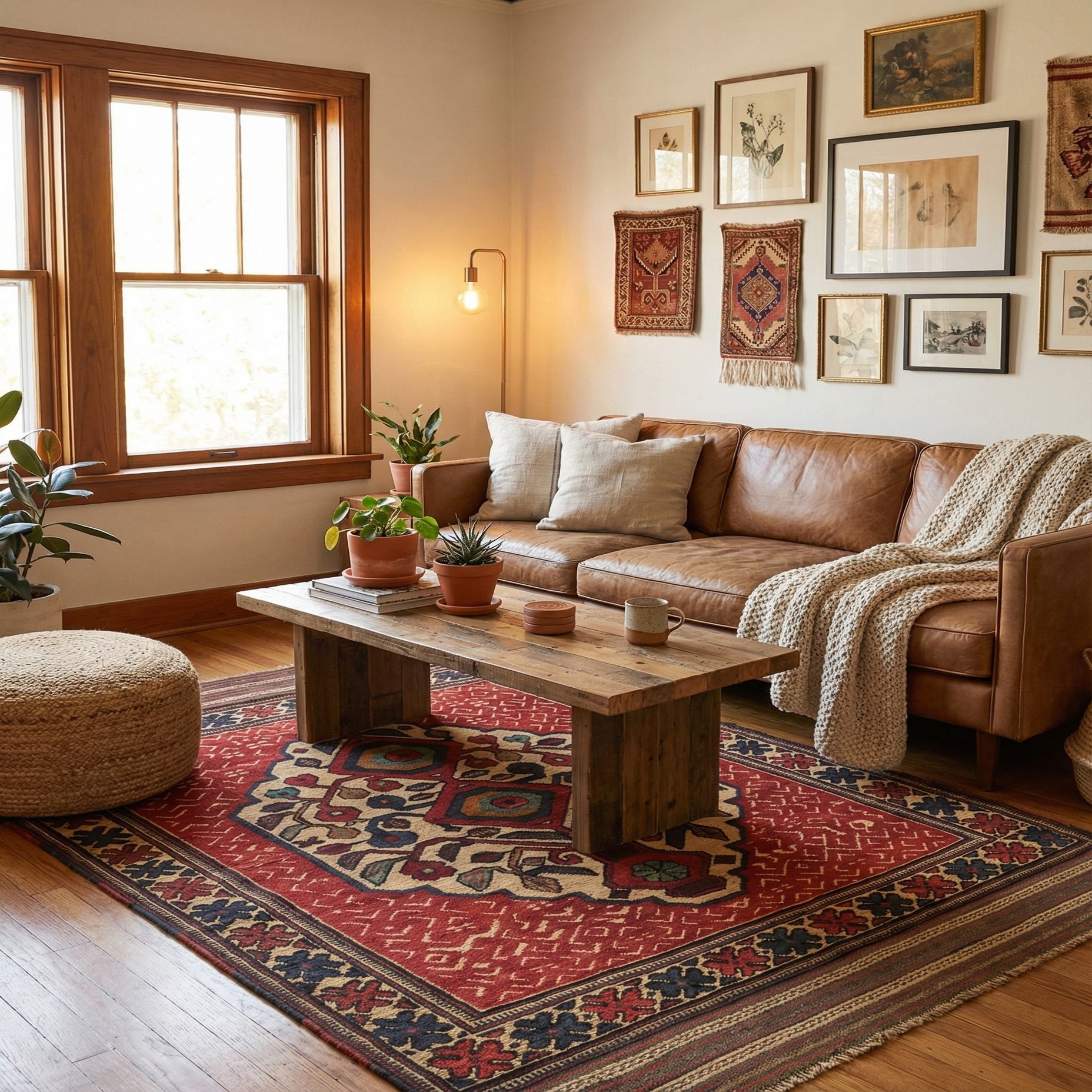 Use this rug to anchor a small seating area, warm up an entryway, or layer at the foot of a bed for added texture. It pairs naturally with warm wood tones and leather, and complements neutral upholstery or navy and gold accent pieces. The pattern and palette suit traditional, transitional, and eclectic interiors that favor handcrafted detailing and grounded, layered color.