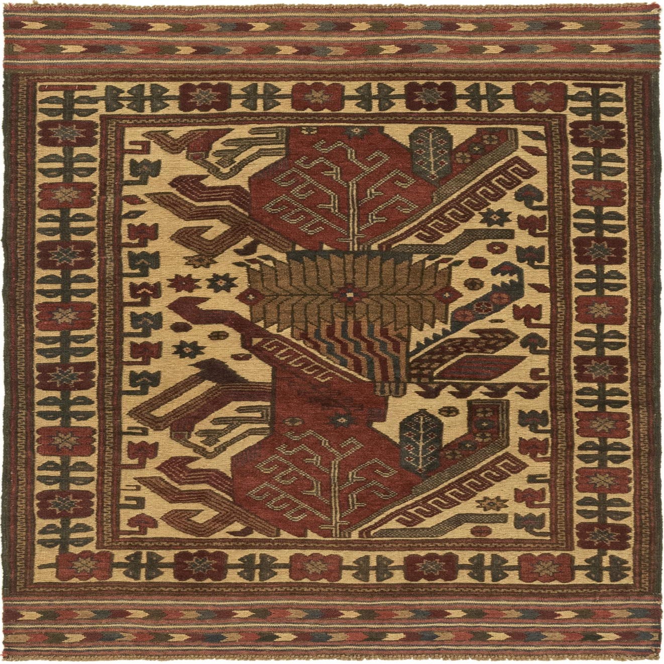 A 4x6 rectangular Sumak rug with a traditional tribal pattern in ivory, cream, and deep red, featuring geometric motifs and a detailed border.