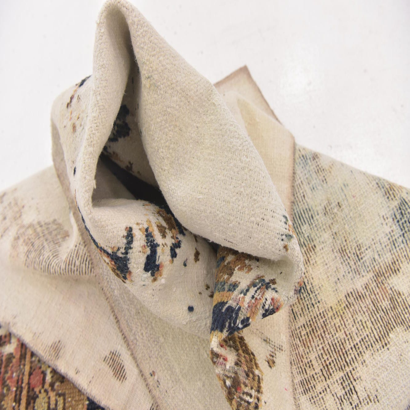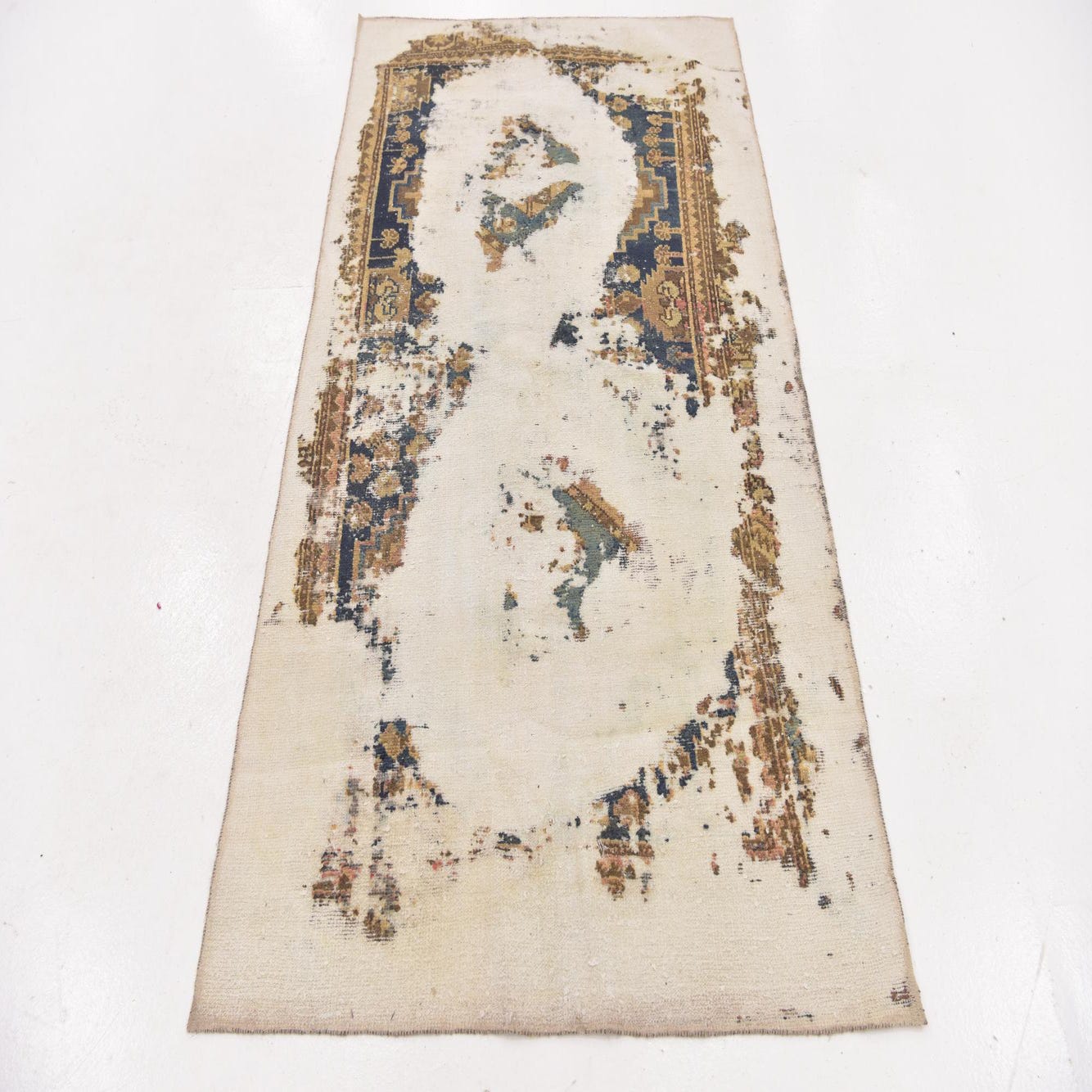 A 4x6 rectangular ivory wool rug with a distressed, abstract Persian pattern in shades of brown, navy, and teal.