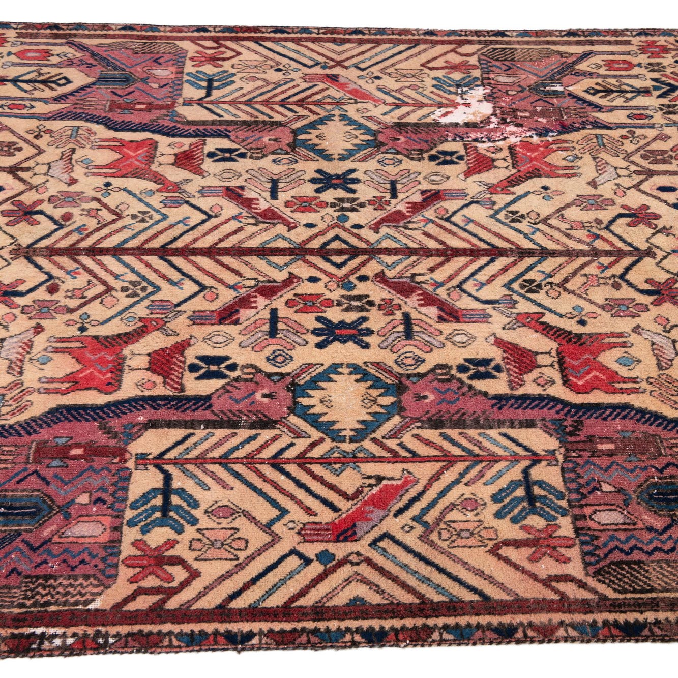Hand-knotted from 100% wool, this rug has a soft, slightly dense pile that invites you to run your hand across its surface and feel the subtle variations where each knot meets the next. An ivory field provides a bright, neutral backdrop for a layered, vintage-inspired pattern: a central vertical motif of stylized branches and geometric medallions is mirrored by small animal and floral figures, while angular tribal accents and faded details add a gently worn character. Accents of brown, red and navy blue punctuate the design, creating contrast and depth without overwhelming the light ground.