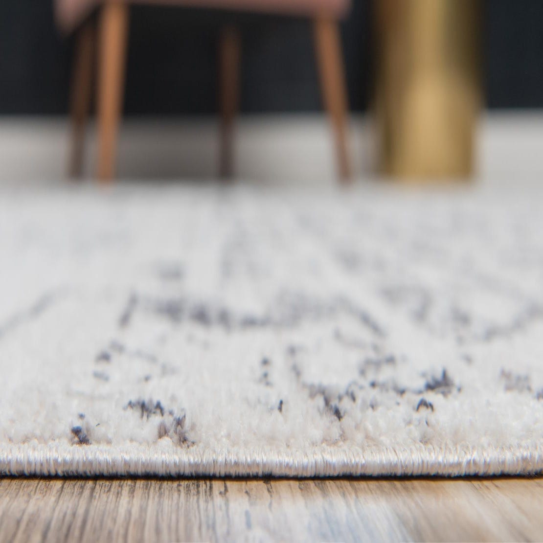 Machine made of 100% polyester (space-dyed yarn), the surface has a low pile with a soft, slightly velvety feel and subtle tonal variation from the space-dyed fibers. The neutral palette and understated pattern make this rug a versatile anchor: place it beneath a coffee table in a modern living room, layer it at the foot of a bed in a serene bedroom scheme, use it to brighten an entryway, or pair it with light woods, linen textiles and matte metal accents in a Scandinavian or transitional dining space.