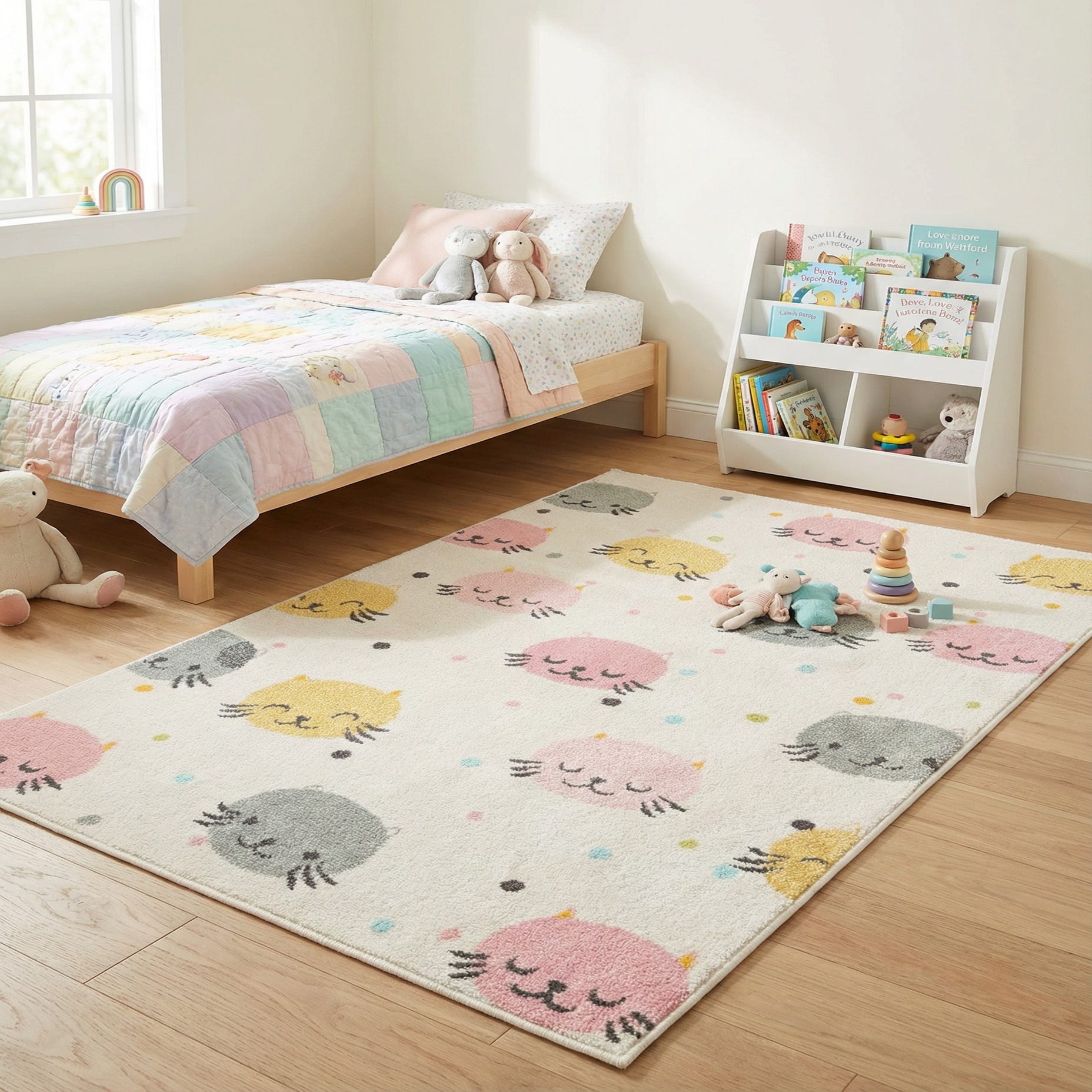 This cheerful design works well as a cozy play surface in a nursery or children's bedroom, or as a lighthearted accent in a family room or reading nook. Pair it with natural wood furniture and pastel textiles for a Scandinavian-inspired space, or place it against white walls and simple storage solutions for a tidy, modern playroom. The color palette and texture make it easy to layer over hardwood or coordinate with existing kids’ décor.