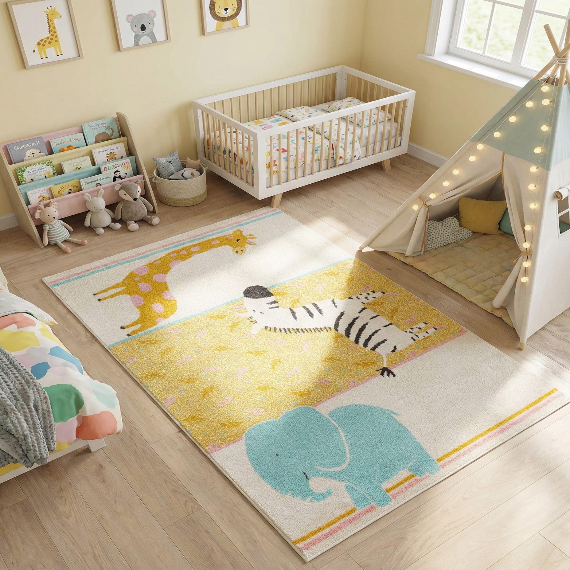 Woven from 100% polypropylene, the rug has a soft, low-pile feel that’s comfortable for play and lays flat in higher-traffic areas. The construction keeps the colors crisp and the motifs well defined, making it an easy piece to anchor a room. It works well under a crib or playmat to create a cheerful play zone, layered in a Scandinavian-inspired bedroom with light wood furniture and pastel bedding, or in a contemporary family room to introduce a lighthearted touch without overwhelming the space.