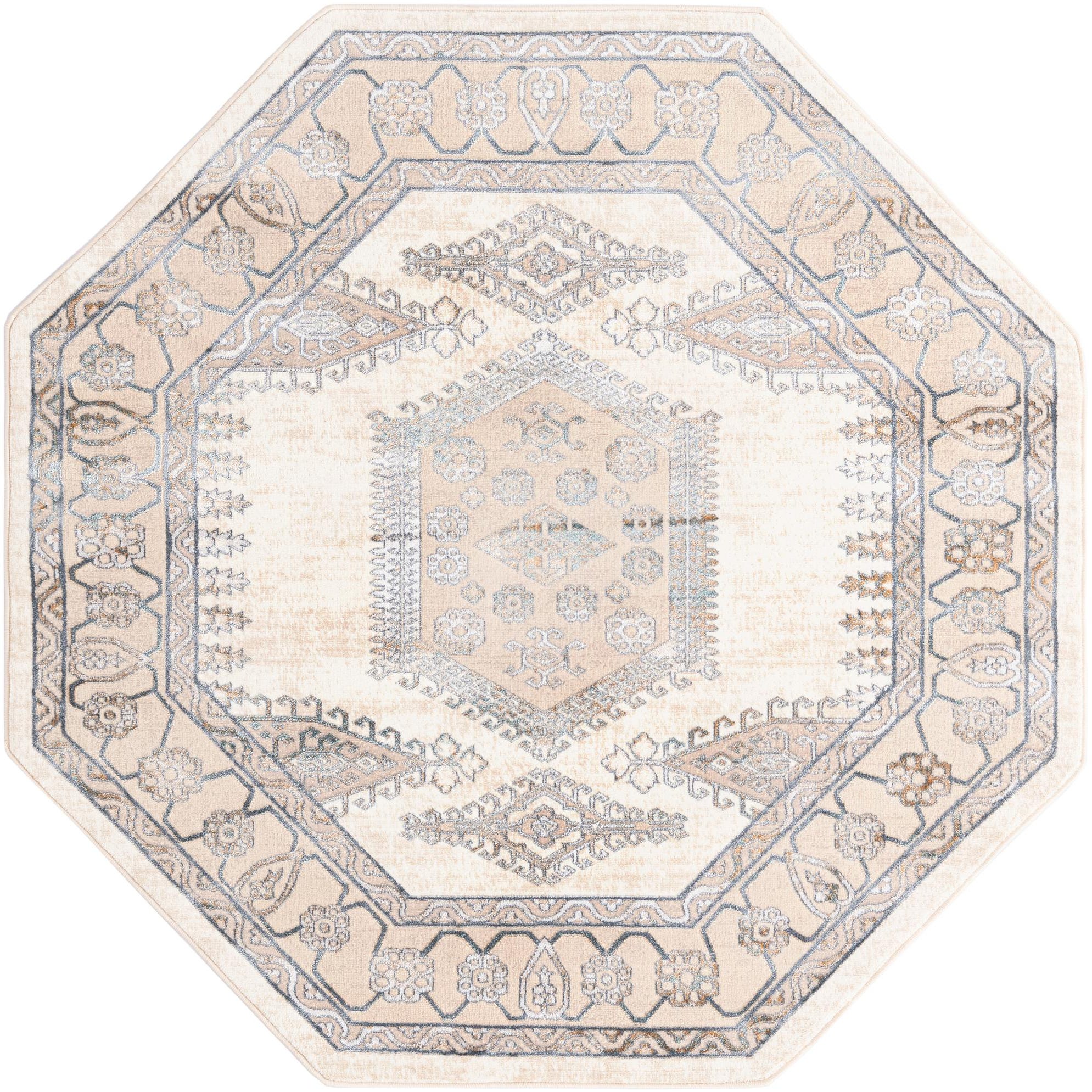 An octagonal medallion rug with a balanced mix of geometric and floral motifs, this piece has an ivory field that brightens a room while soft beige, light brown, gray and deeper brown accents trace the central medallion and inner border. The patterned border features repeating floral and arabesque elements set within angular guard bands, giving the design a traditional foundation with a transitional, slightly weathered character that fits a range of interiors.