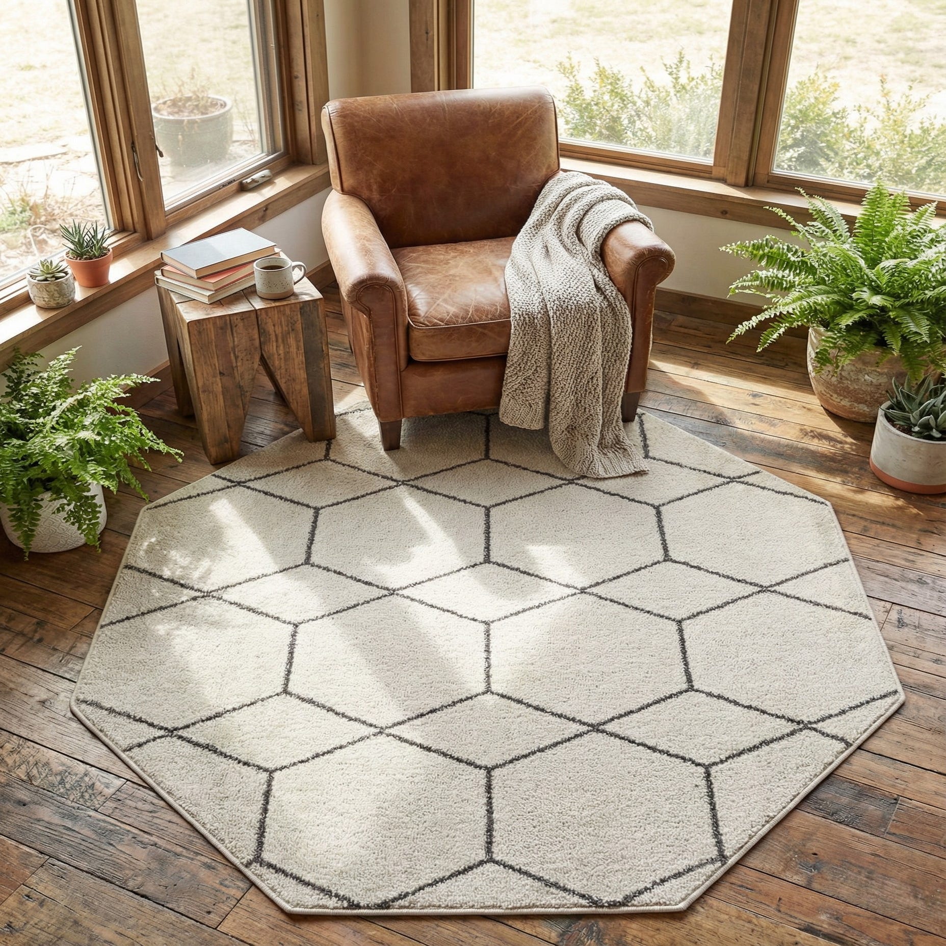 The octagonal shape works beautifully in small seating areas, under a round café table, at the foot of a bed, or in an entryway where you want a distinct focal point without overwhelming the room. Pair it with light wood furniture and linen upholstery for a Scandinavian vibe, mix with matte black metal accents for a modern-industrial setting, or layer it over a larger rug in a transitional living room to add pattern and visual interest.