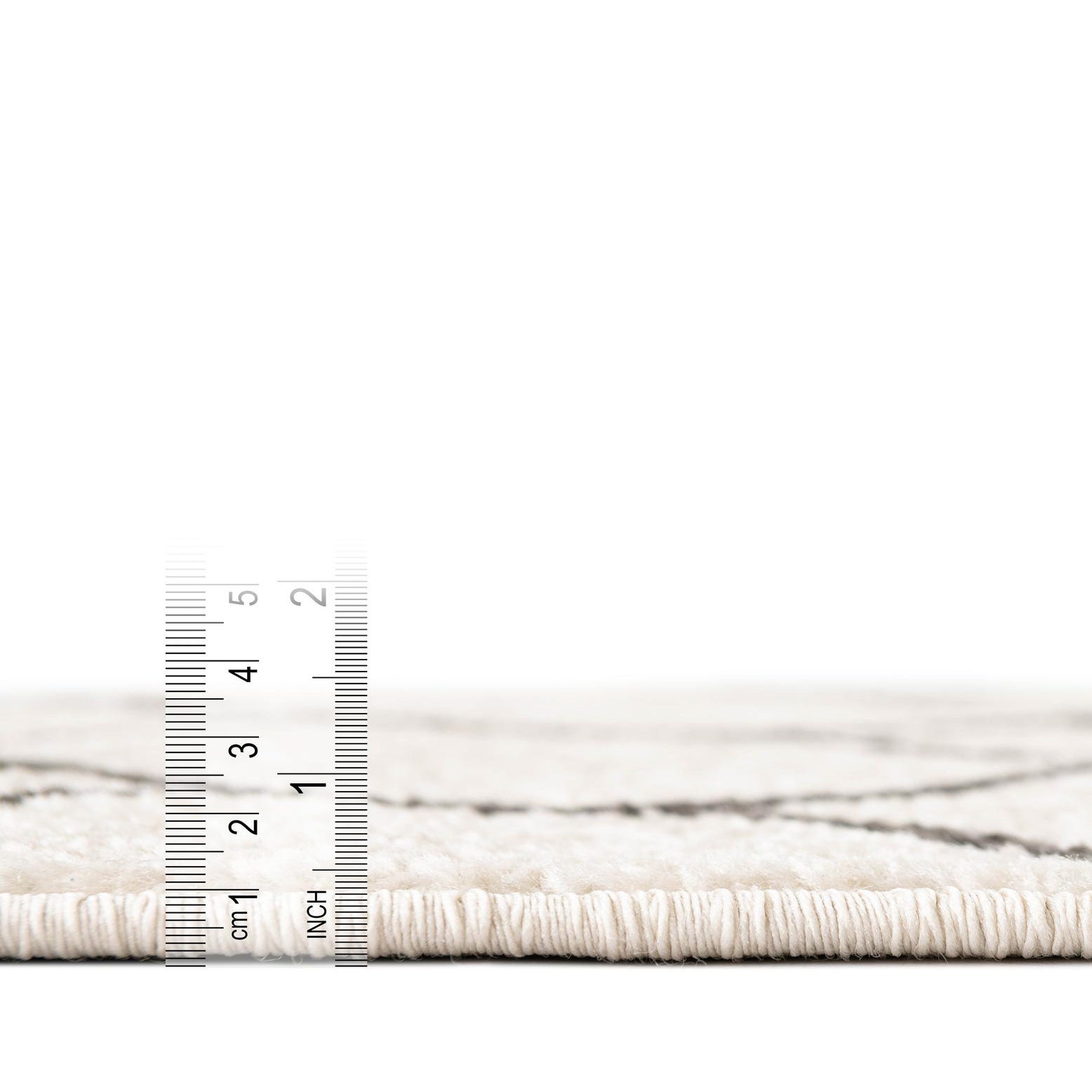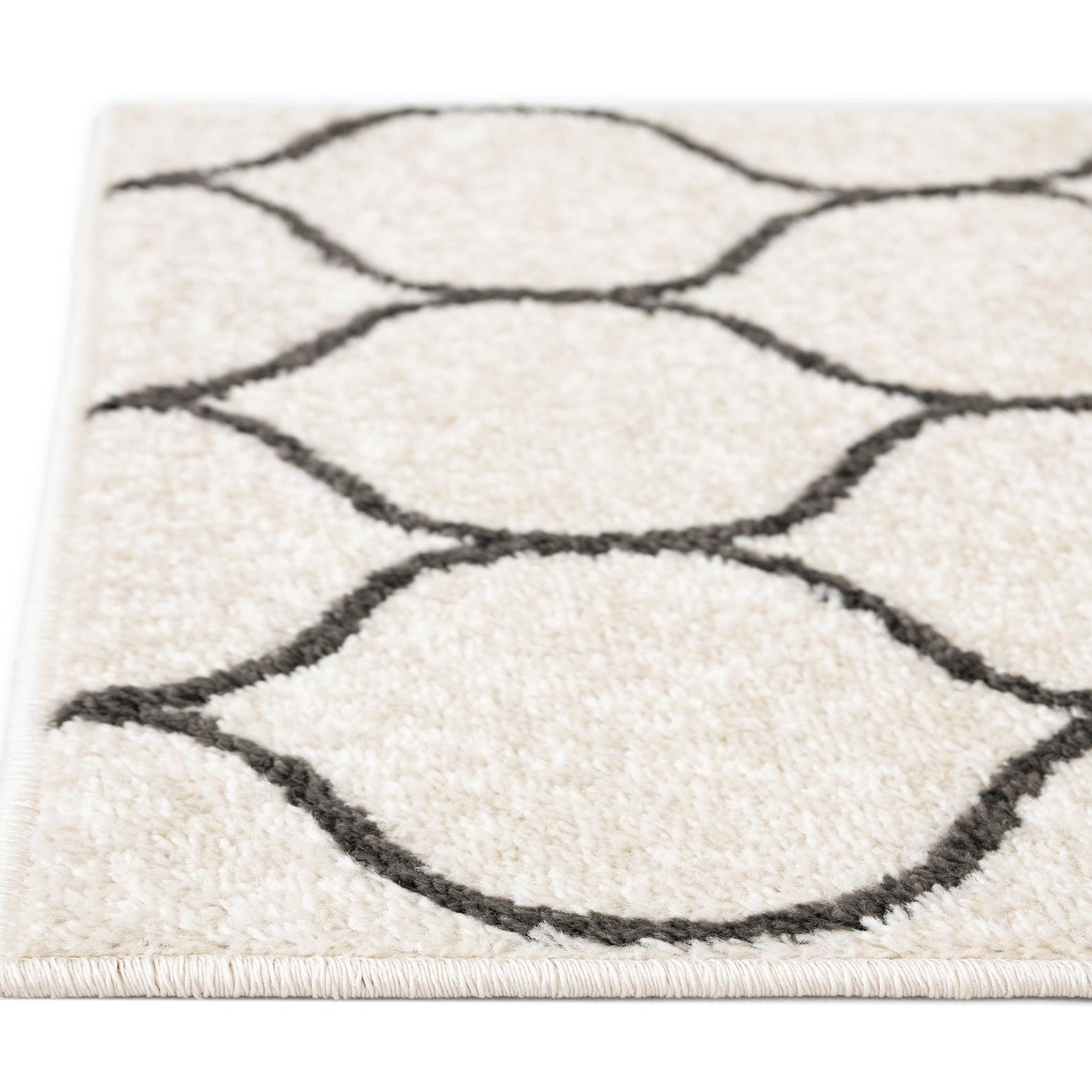 Machine-made from 100% polypropylene, the rug has a low-profile pile with a soft hand; the gray lattice has a subtle texture that contrasts with the smoother ivory ground. Style it with light-wood or brushed metal furnishings and natural textiles for a Scandinavian or modern transitional look, place it beneath a compact seating group or round dining table to define a smaller zone, or use it in an entryway or bedroom to introduce pattern without overwhelming the room.