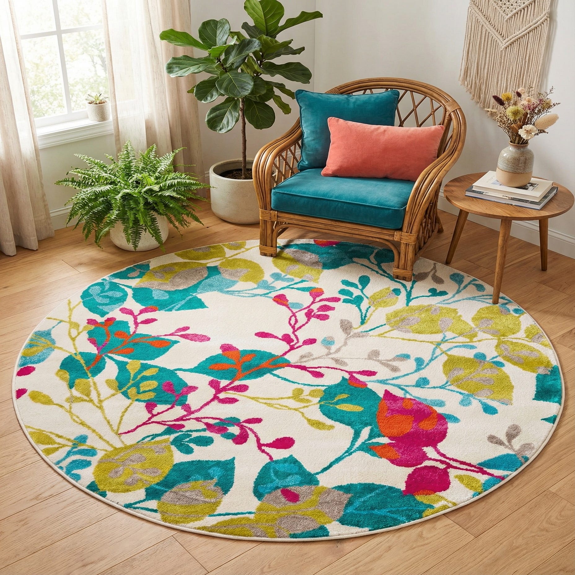 This round piece brightens a variety of interiors: place it beneath a small dining table to add color to a breakfast nook, center it in a casual living room to anchor seating, or layer it in a bedroom or nursery for a cheerful touch. It pairs well with natural wood tones and white or soft-gray walls, and responds nicely to solid accent pillows or throws in teal, fuchsia or muted gray to pick up its key colors.