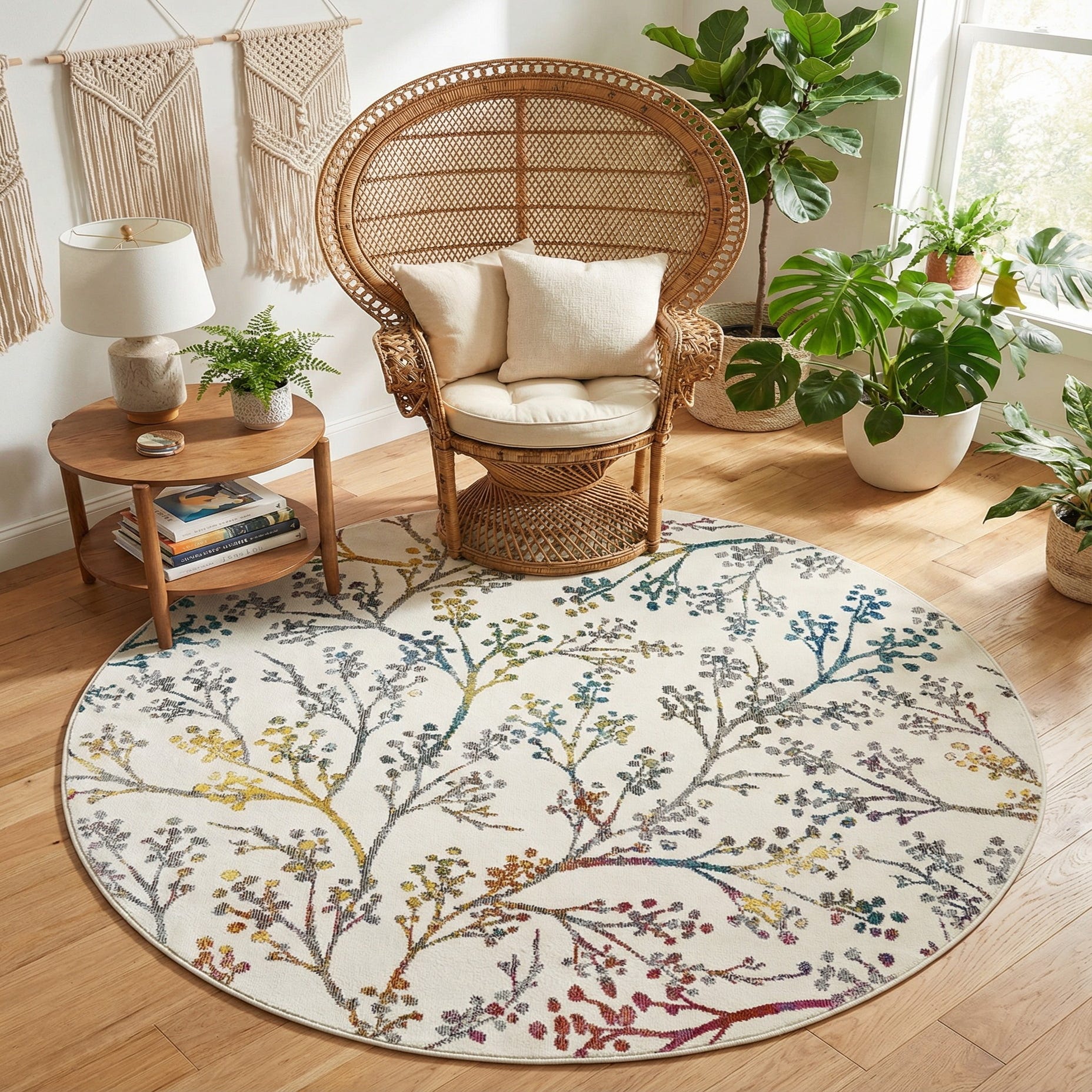 With its array of colors and natural-themed display, this rug can integrate well in various decor settings. The softness of the color tones allows for versatility, making it a suitable choice for spaces such as a sunlit living room, serene bedroom, or even in a home office for a touch of elegance and comfort. Due to the circular form, it wonderfully complements round dining tables, coffee tables, or can serve as a focal point in an entryway. This piece is a tactful choice for introducing a blend of color and pattern without overwhelming a space.