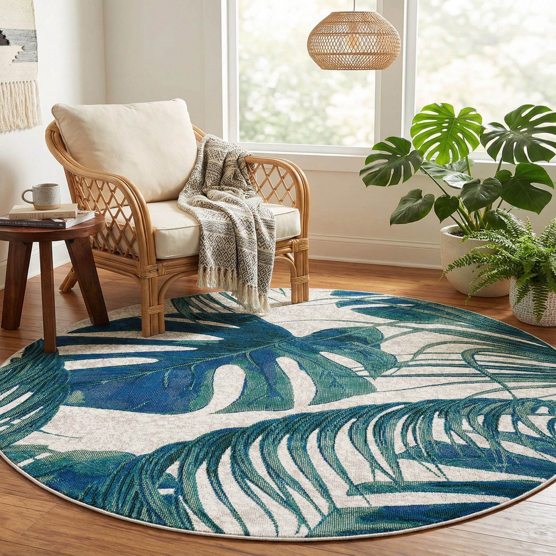 The round shape and lively botanical motif make this piece ideal to anchor a small seating nook, sit beneath a bistro table, or bring color to a sunroom or covered porch. Pair it with natural wood or rattan furniture, linen textiles and matte black metal accents to emphasize the coastal-contemporary look, or use it to add a fresh, modern touch to a neutral living room.