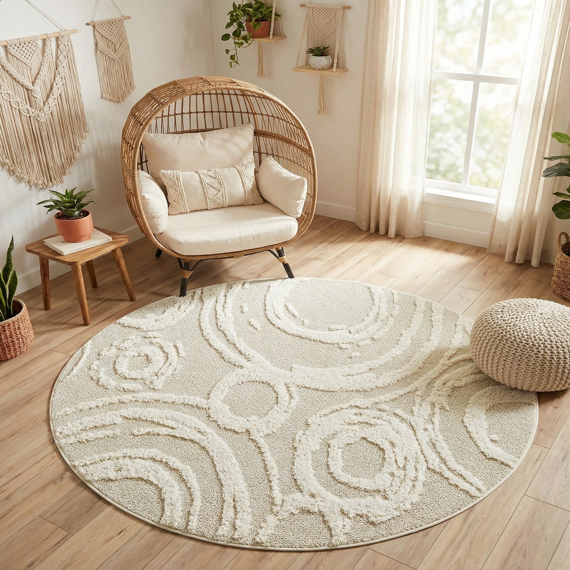 Ivory forms the backdrop for a softly sculpted abstract pattern of concentric rings and sweeping arcs. The motif is created with a slightly higher, looped pile that provides a tonal contrast against the flatter ground, giving the design a layered, organic look that reads clean and contemporary. The overall effect is calm and versatile, suited to neutral-focused interiors that favor texture over bold color.