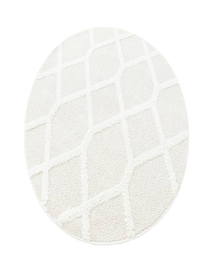 A soft ivory ground anchors a clean, tonal trellis pattern worked in a slightly higher pile for gentle relief and visual interest. The machine-made construction in 100% polyester combines a low-loop background with raised, textured lines, so the surface feels both smooth and subtly cushioned underfoot. The monochromatic palette keeps the look light and versatile while the geometric motif adds a relaxed, modern sensibility.