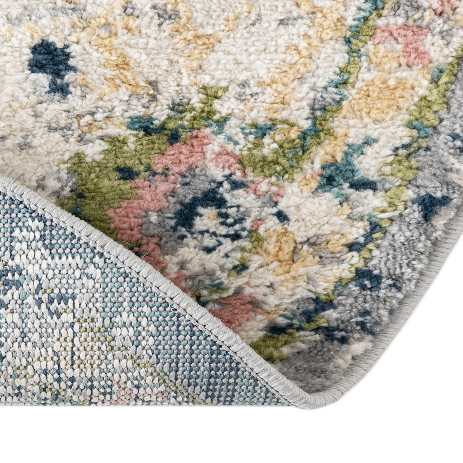A vintage-inspired medallion pattern rests on an ivory background, rendered in a softly distressed, painterly finish. Deep blues and navy form the central motif, while touches of gray, light green and pink weave through floral and ornamental details for a layered, lived-in look. Machine made from 100% polypropylene, the rug has a low, dense pile that feels smooth underfoot and offers subtle surface texture where the pattern fades and reappears.