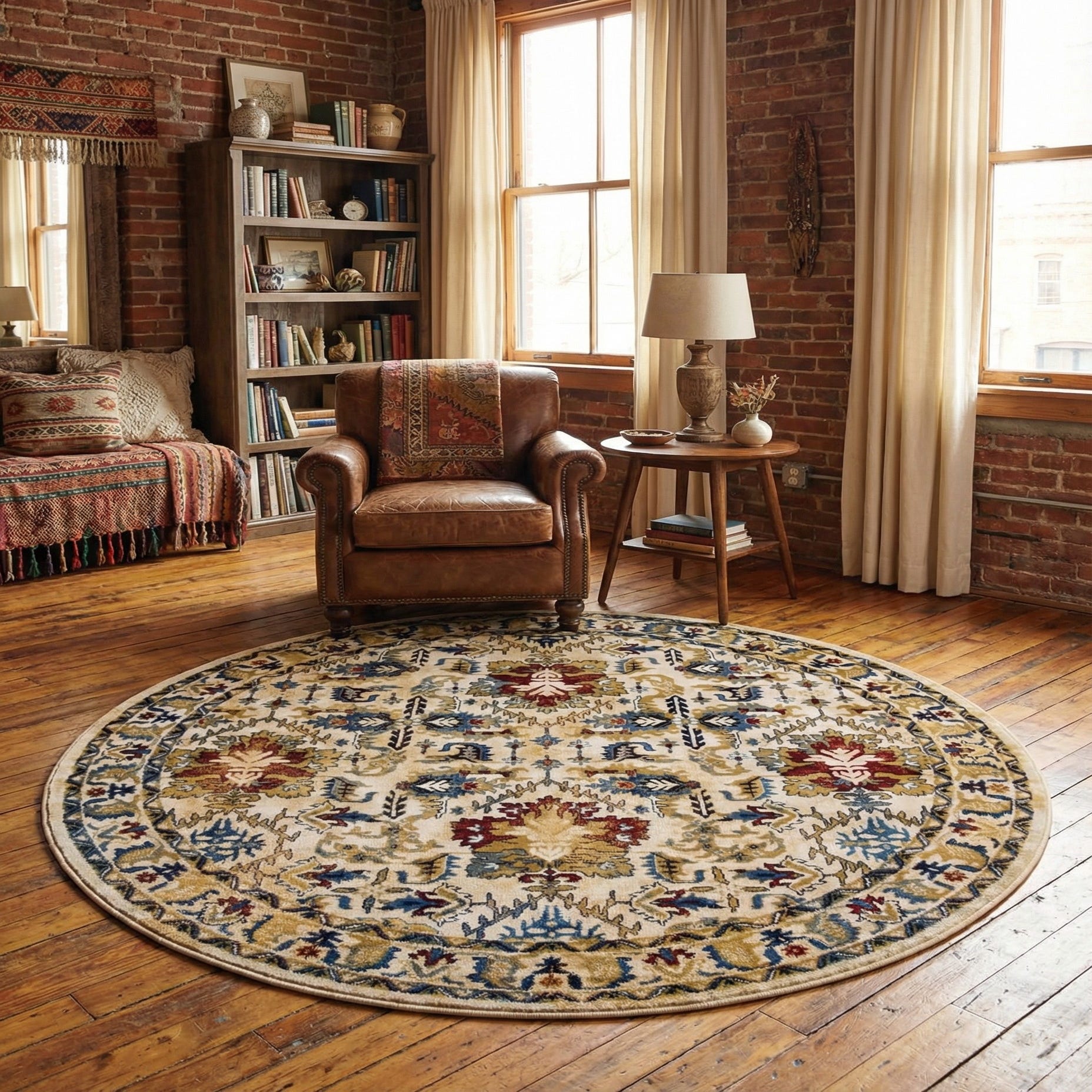 Machine-made in 100% polypropylene, the pile has a low profile with a softly dense hand that feels smooth underfoot and holds its shape well in everyday rooms. Its round silhouette is ideal for anchoring a breakfast nook, centering a conversation area, or adding a warm layer beneath a round dining table. Pair it with warm wood finishes and neutral upholstery for a cohesive traditional look, or use navy and red accents to bring out the rug’s richer tones in a transitional living room or home office.