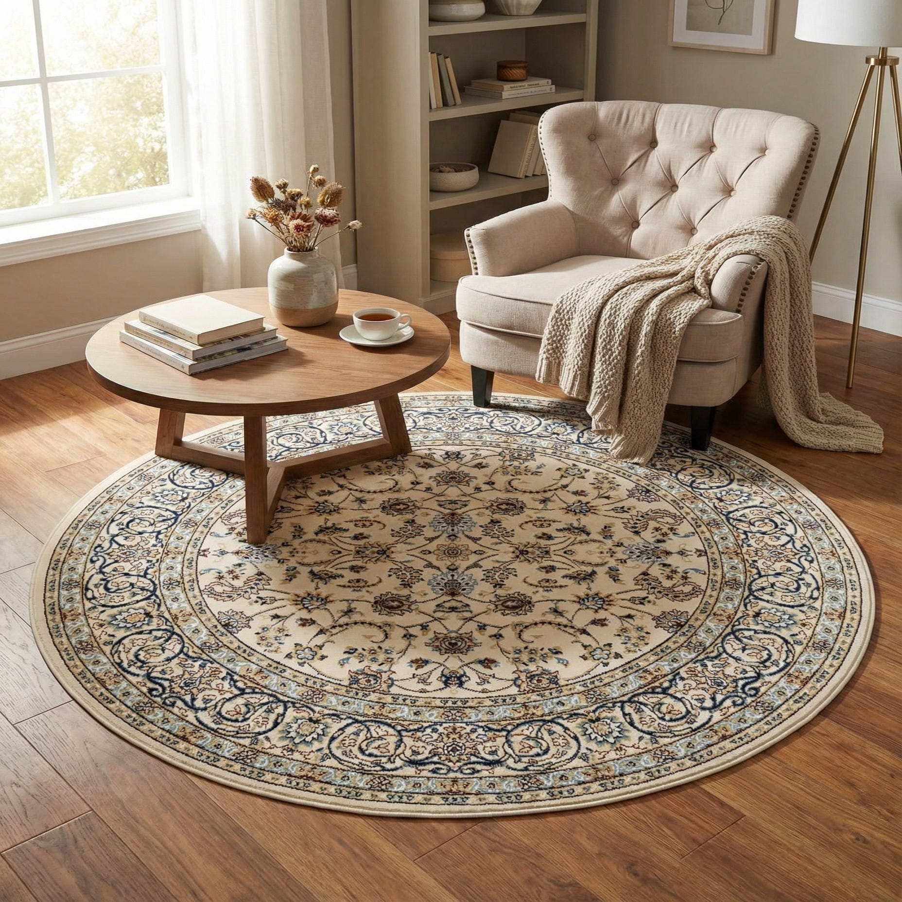 A classic Persian-inspired round rug with an ivory ground detailed by a graceful arrangement of floral vines and a subtle central medallion. The ornate border frames the field with scrolling arabesques and floral rosettes in navy blue, light blue, burgundy, puce, light green and cream, creating a balanced, layered look. The ivory background keeps the overall effect light and versatile while the darker navy and burgundy accents add depth and definition to the pattern.