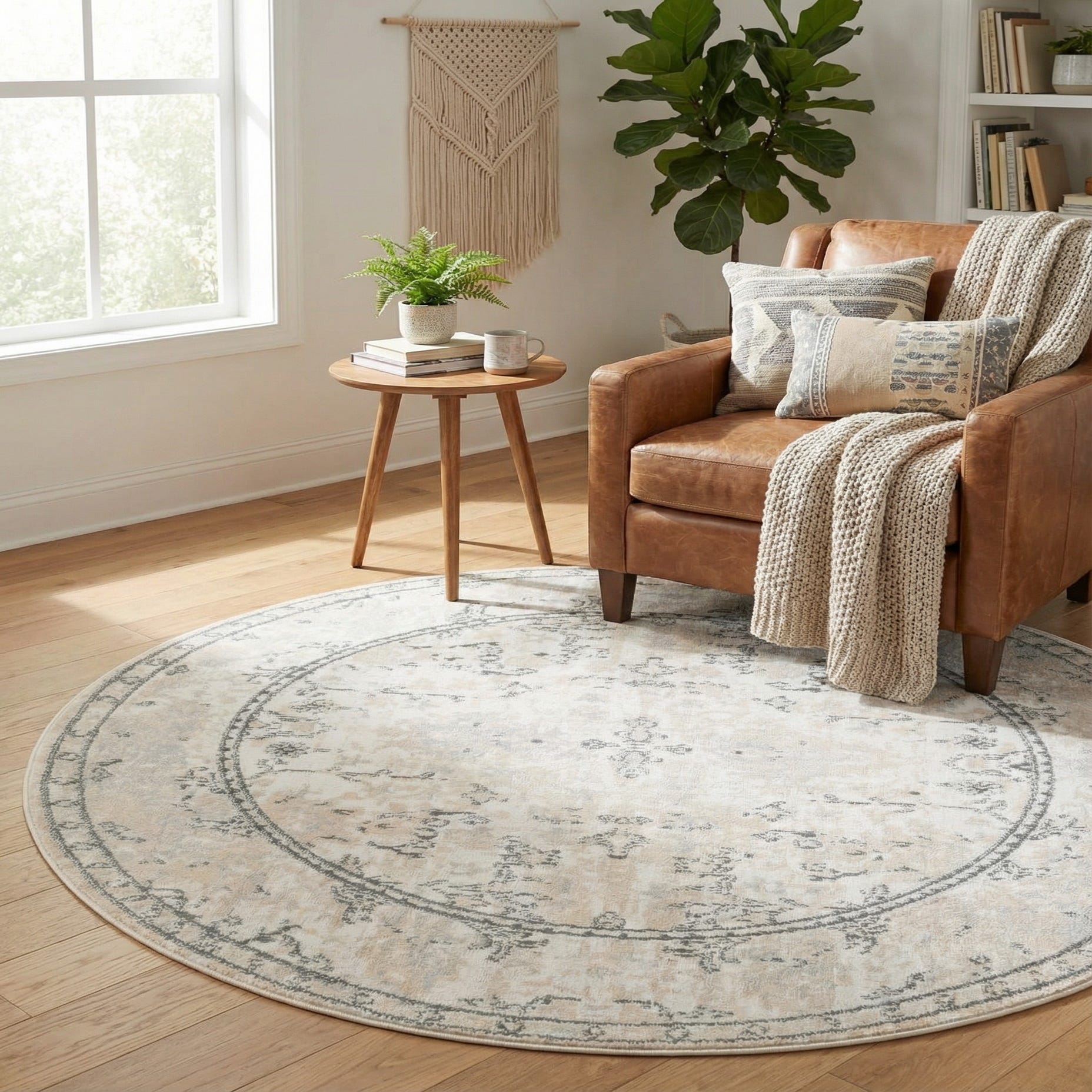 The round silhouette is ideal for defining seating areas, sitting beneath a round dining table, or warming an entry or bedroom corner. Its muted palette and subtle pattern work well in transitional, farmhouse, coastal, or contemporary neutral interiors — pair it with light woods, soft linens, or metal accents to create a layered, balanced look.