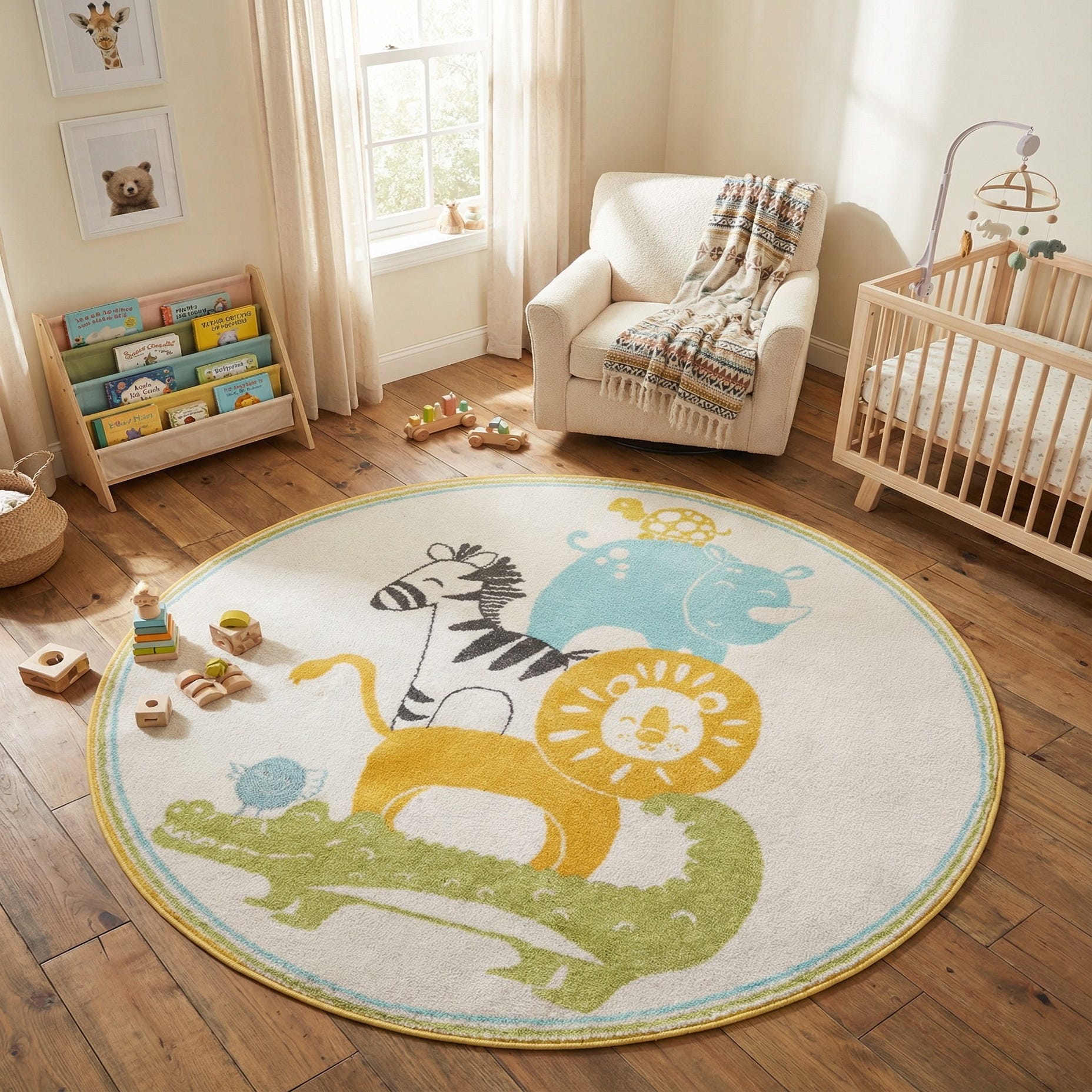 The round shape makes this rug well suited to a nursery or playroom reading nook, or as a colorful anchor for a small table and chairs. It pairs nicely with natural wood furniture, pastel textiles, or crisp monochrome accents, and fits into modern, Scandinavian, or casual children’s décor schemes where a playful focal point is wanted.