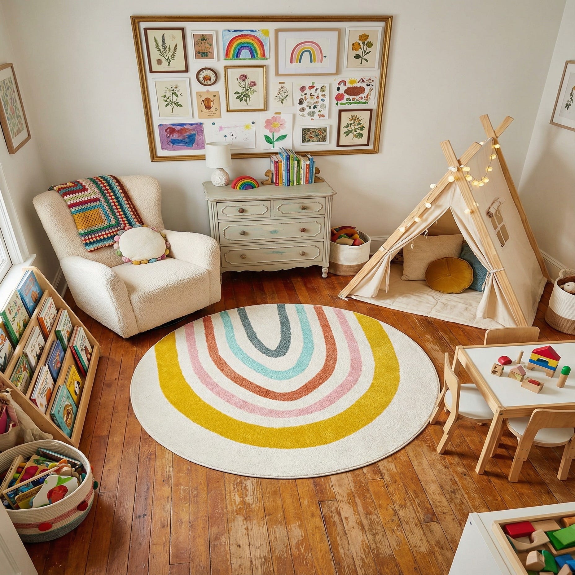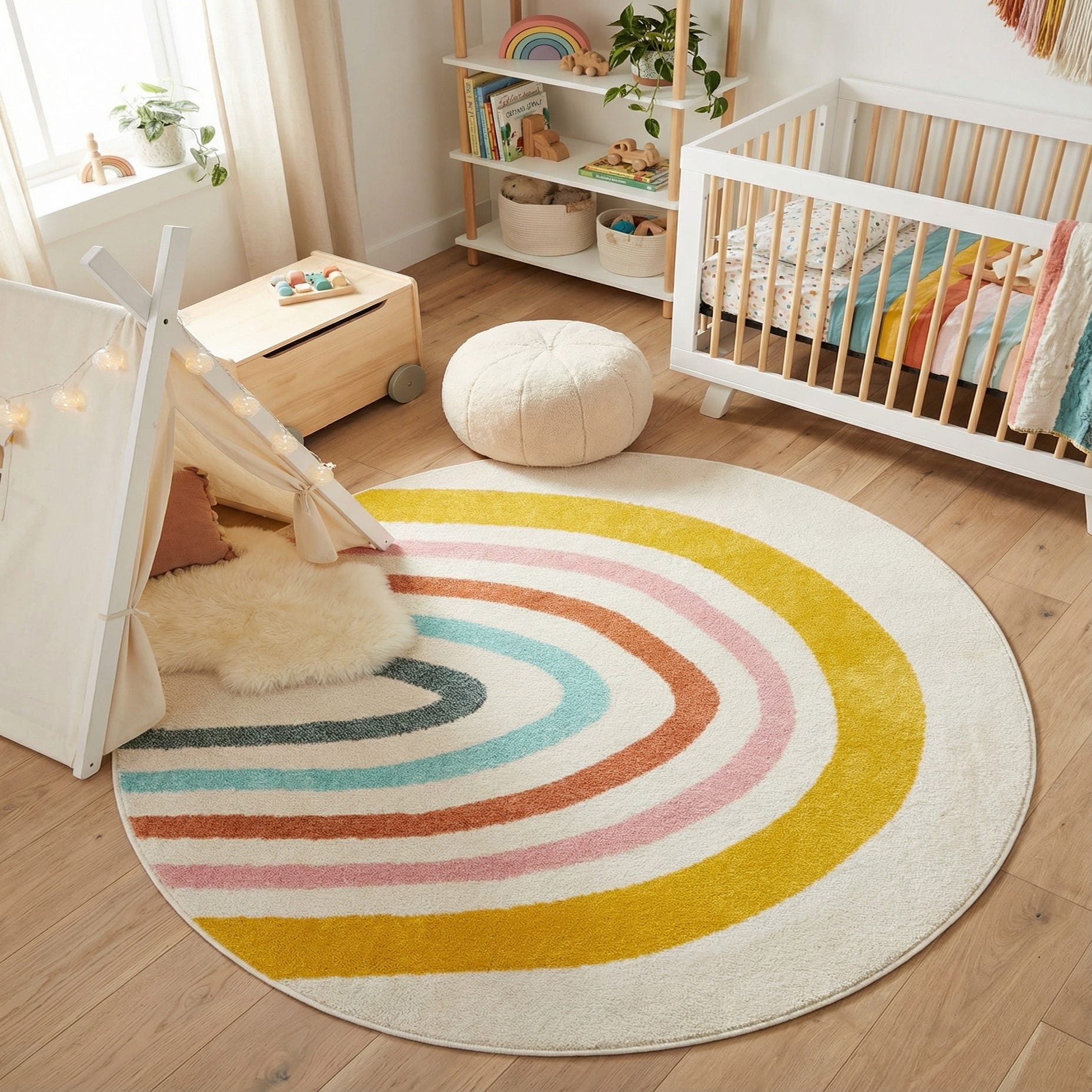 This rug works well in a child’s bedroom or nursery, a bright play area or a cozy reading nook where its cheerful palette adds personality without overwhelming the room. It also pairs nicely with contemporary or Scandinavian furnishings—think natural wood, simple silhouettes and neutral textiles—where the curved lines and warm pops of color become a focal point beneath a small round table, toy setup or bedside seating.
