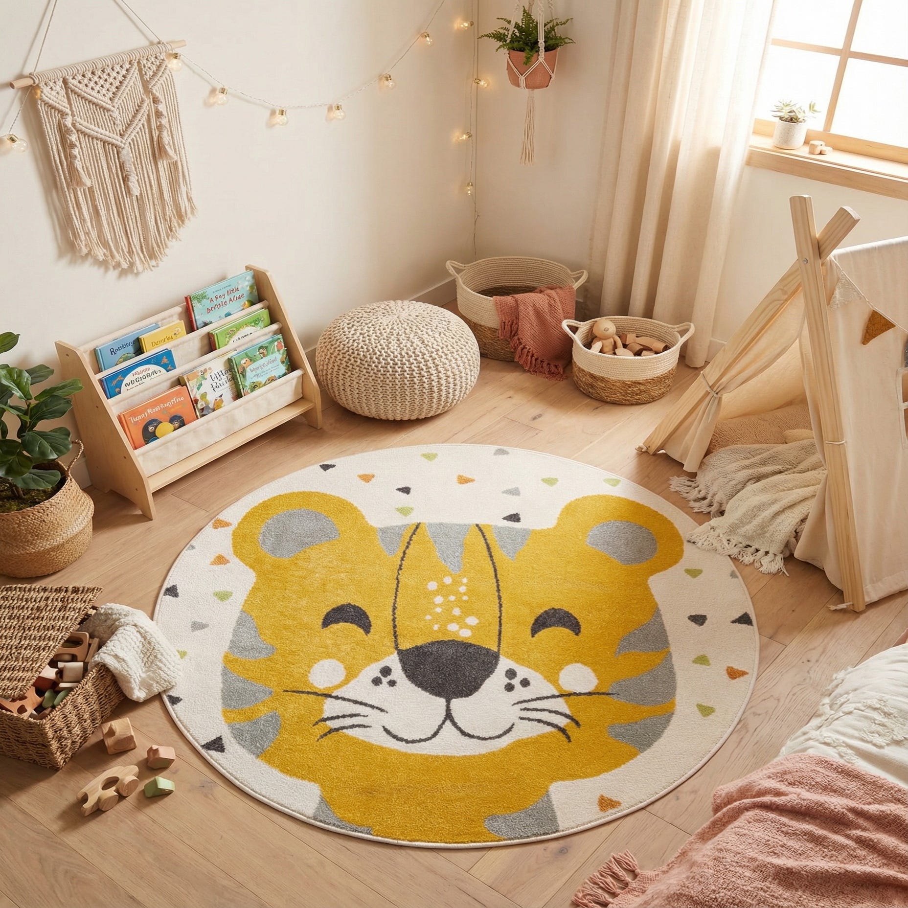 A smiling tiger face fills the round ivory field, rendered in warm yellow with soft gray stripes and bold black detailing for the nose, eyes and whiskers. Small, scattered triangle accents echo the main palette in yellow, gray and black, giving the layout a playful, graphic quality that stays lively without overcrowding the design. The surface has a soft, low-profile pile you can feel underfoot; machine-made of 100% polypropylene, the construction gives the pattern clear, well-defined edges and a gentle texture that invites touch.
