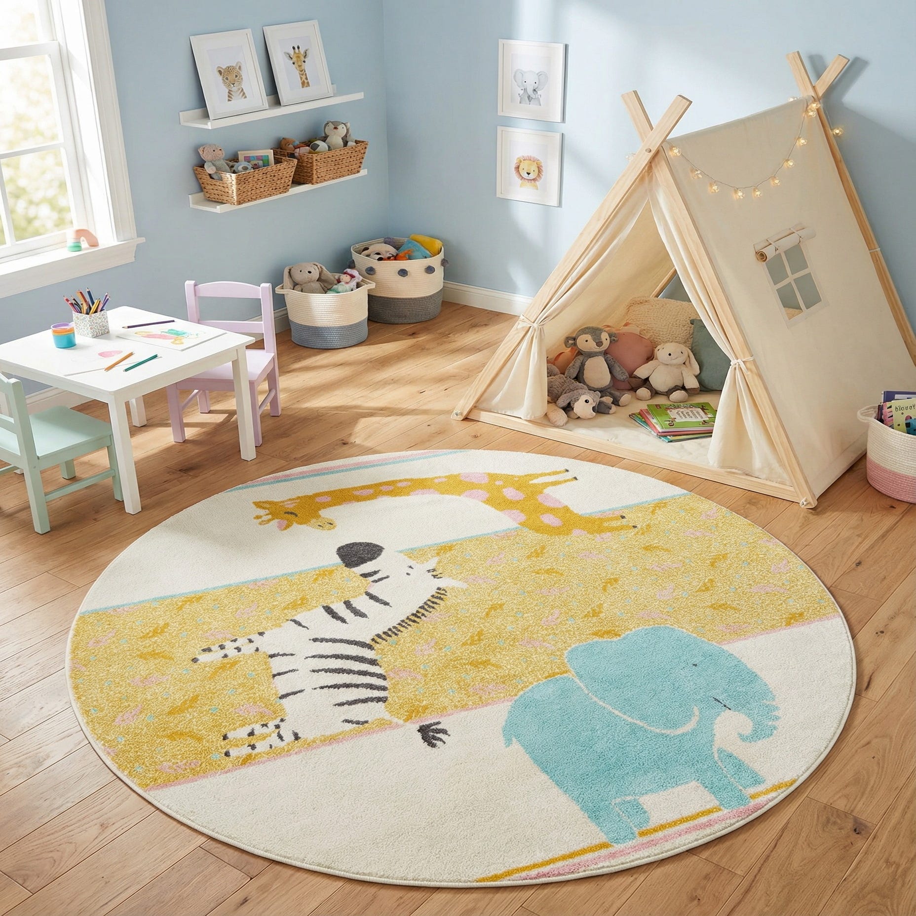 This round rug presents a playful, storybook scene on an ivory field: a golden-yellow band across the center suggests a sunny strip of texture dotted with tiny pink and blue accents, while a mustard giraffe with pink spots, a boldly striped black-and-ivory zebra, and a soft aqua elephant create a friendly animal trio. The illustrated, hand-drawn motifs have a casual, whimsical style that feels approachable and fun. Crafted from 100% polypropylene, the rug offers a soft, slightly plush pile with a resilient hand underfoot.