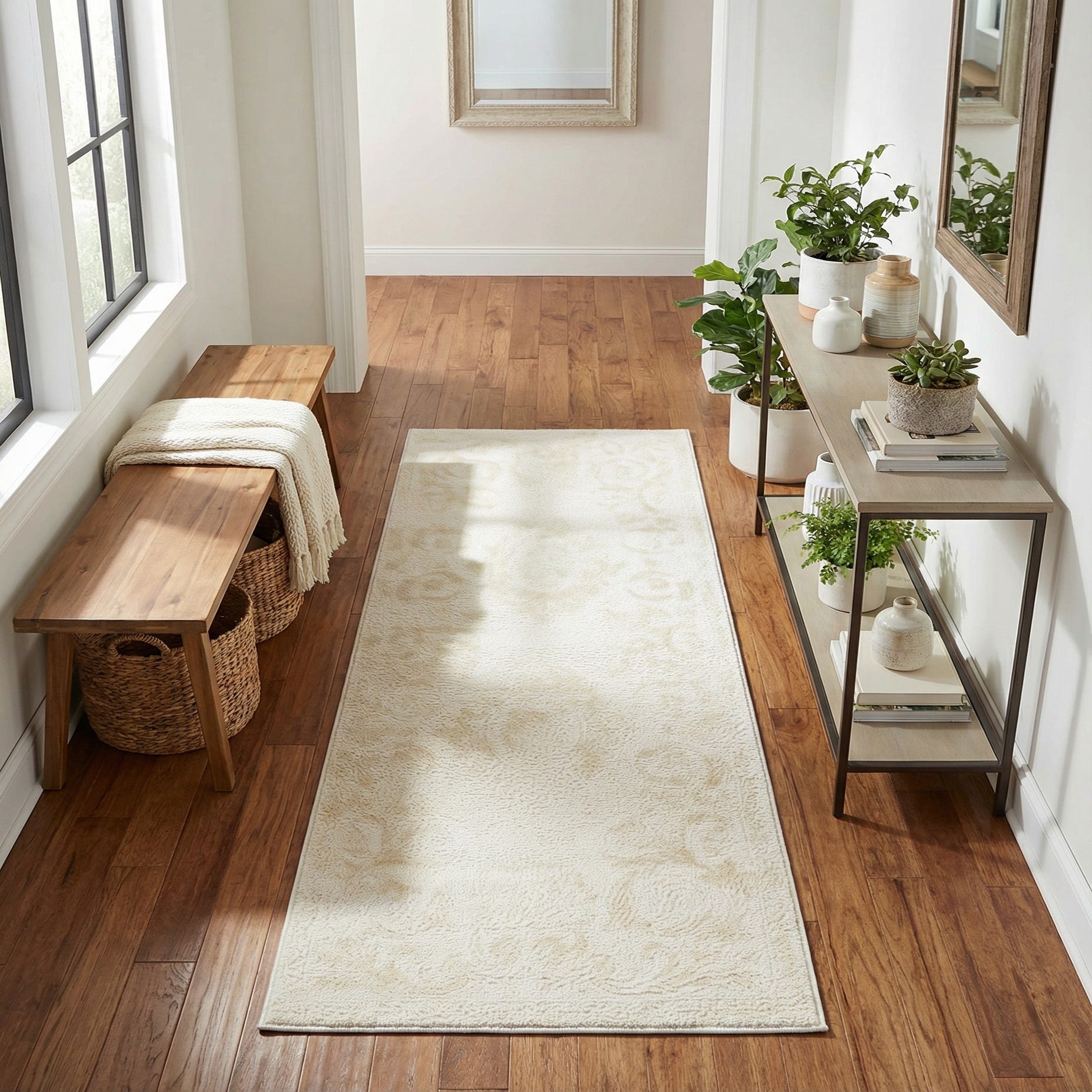 An ivory ground is softened by a low-contrast scrolling medallion and vine motif in pale cream and beige, lending the runner a refined, understated look. Machine made from 60% polypropylene and 40% polyester, the construction creates a dense, low-to-medium pile with a subtle cut-and-loop texture that raises the pattern slightly above the field. Running your hand across it reveals a smooth, cushioned surface that stays visually light while offering pleasant underfoot comfort.