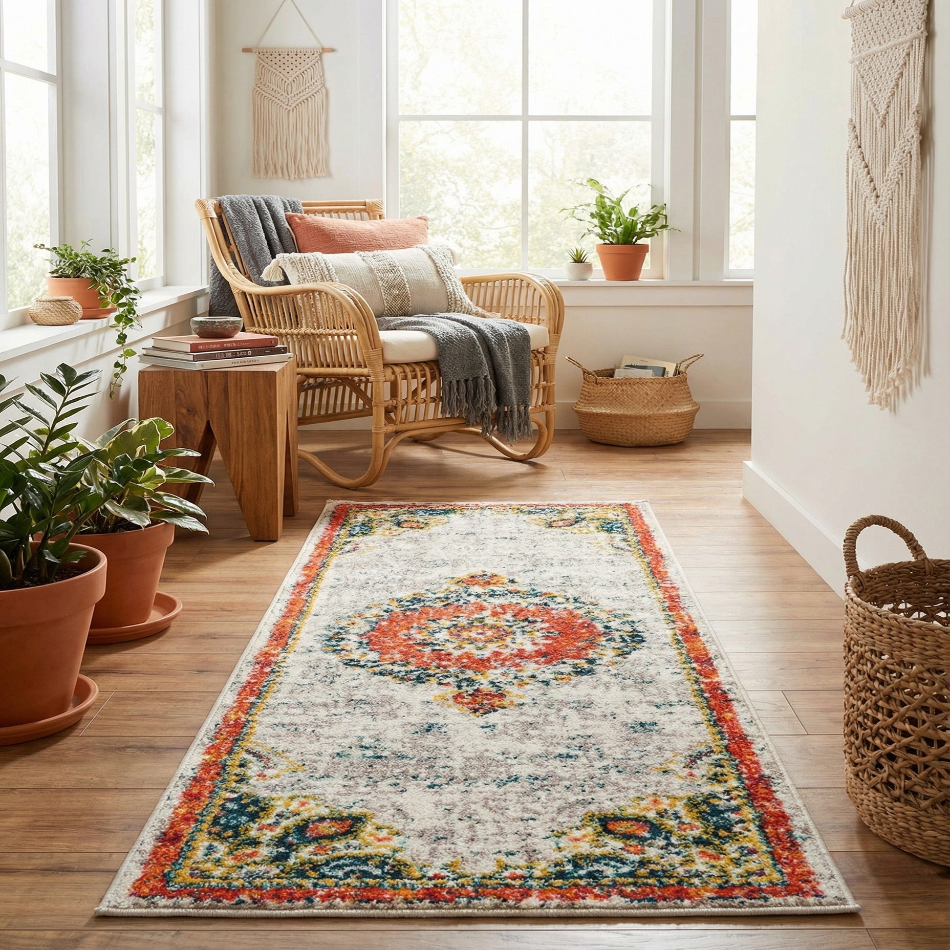 A 5 ft runner rug with an ivory and cream background, featuring a vibrant red, blue, and yellow medallion pattern and border.